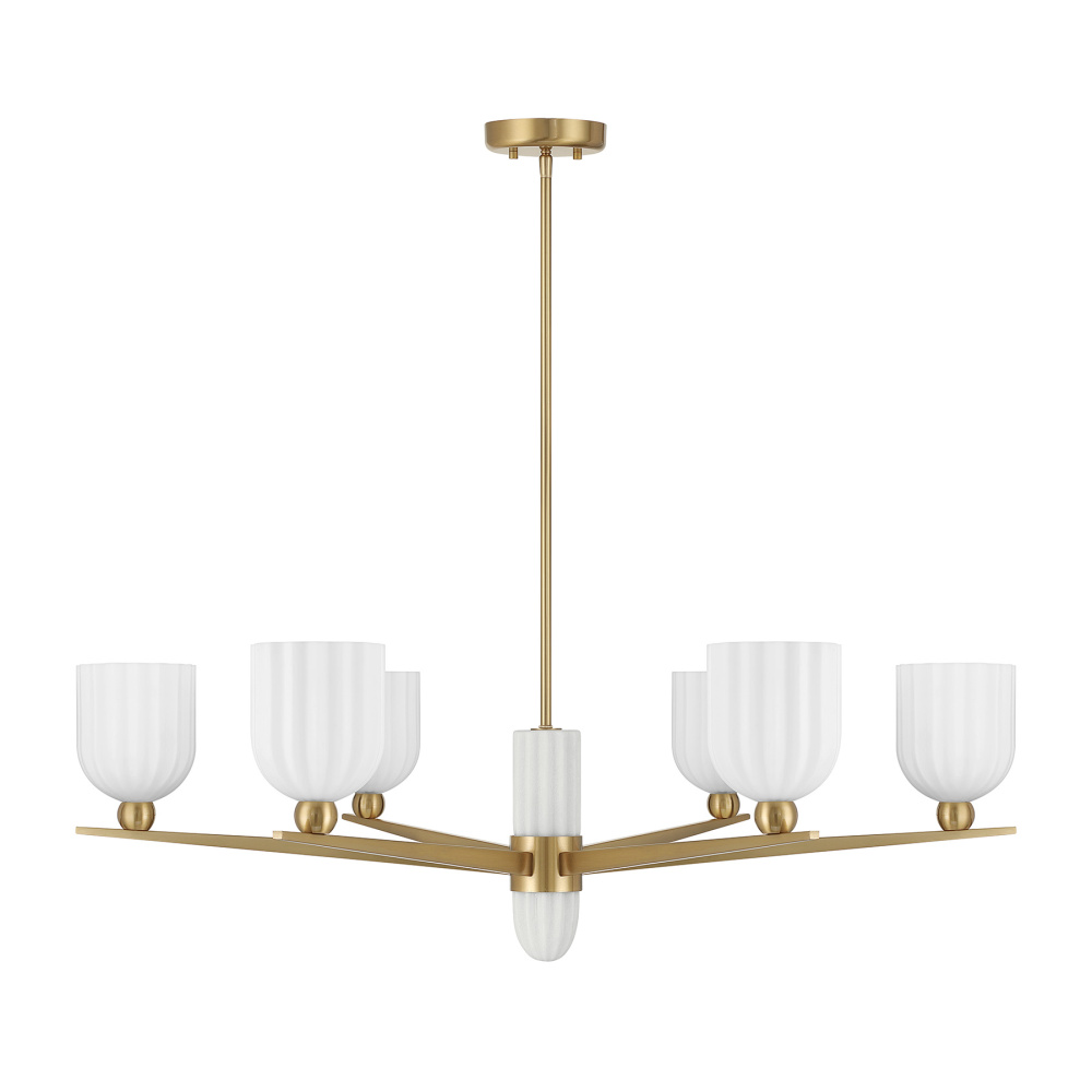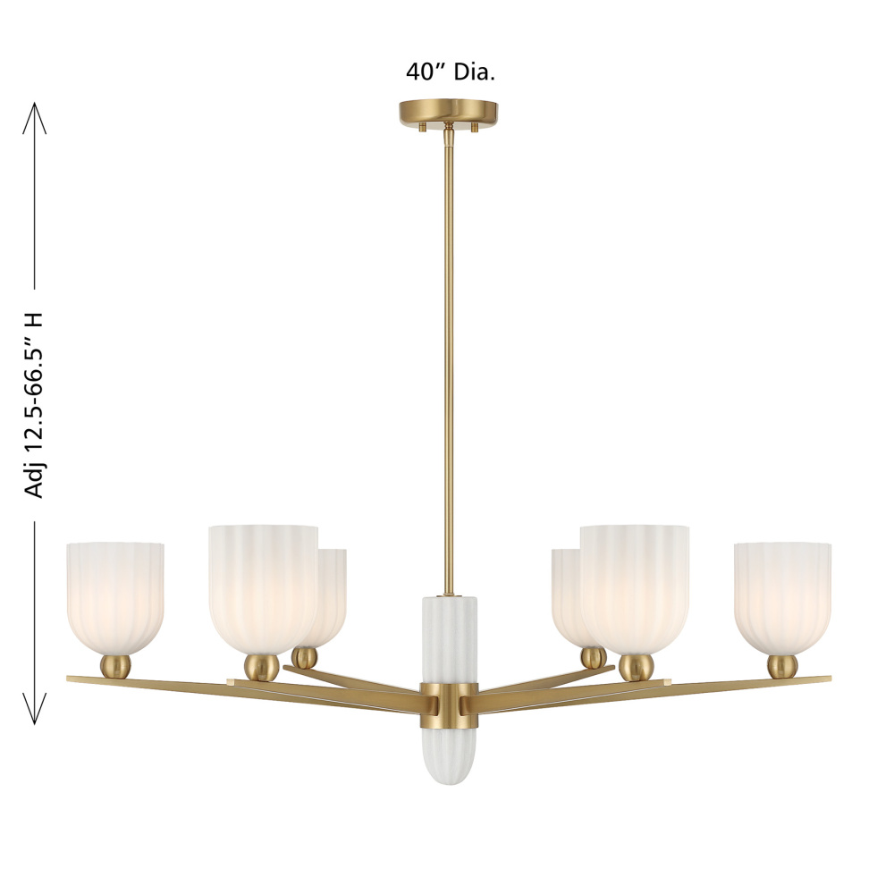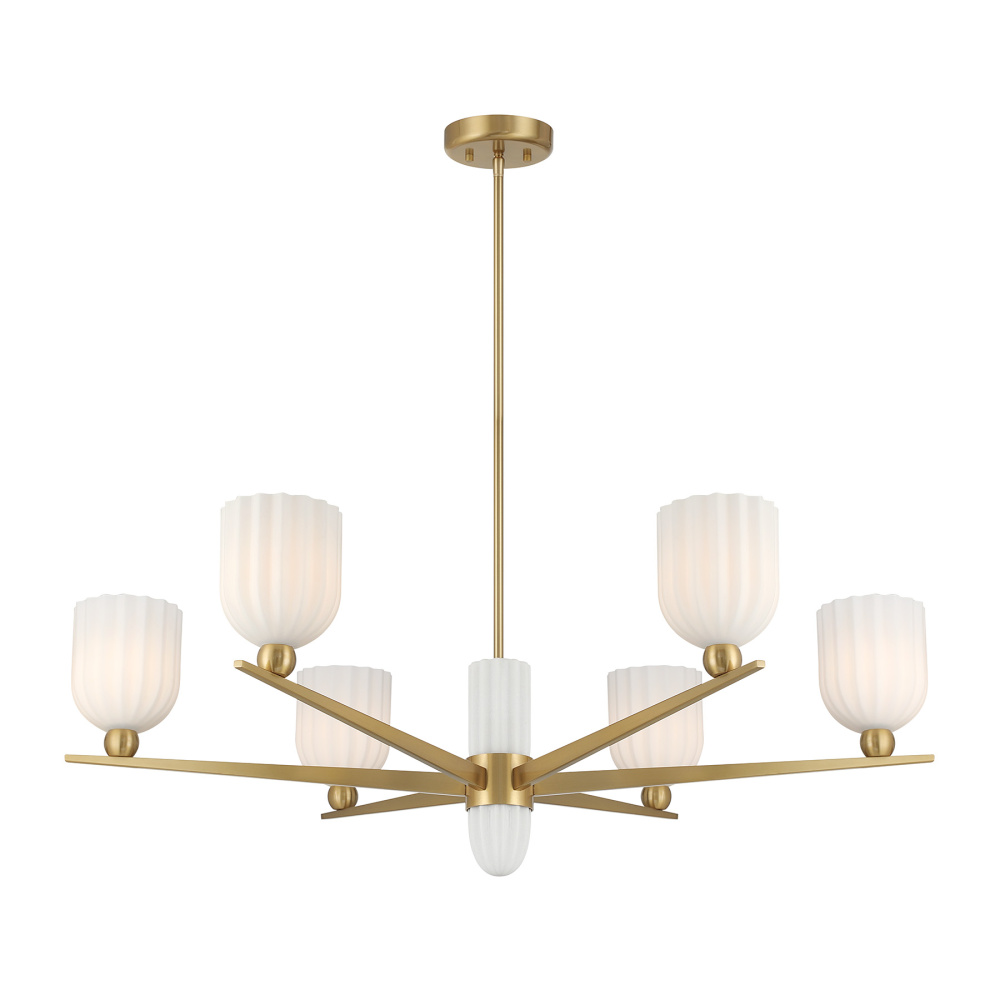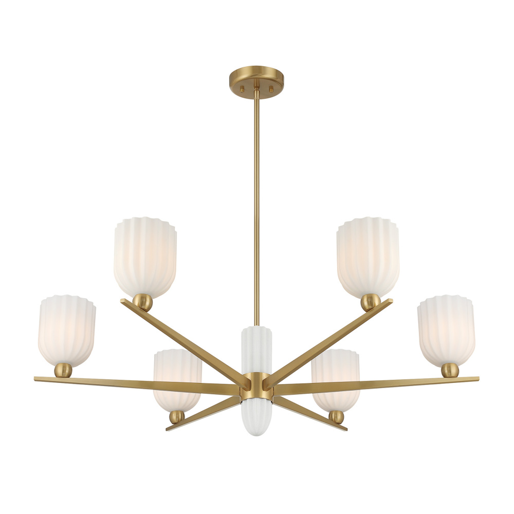 Discover a boldly sculptural take on mid-century modern lighting with the Savoy House Collier 6-light chandelier. Slender, pointed arms radiate outward like a starburst, each topped with a ribbed white opal shade that softens the light with natural warmth. The Warm Brass finish pairs beautifully with the organic white hue, creating a look that feels both retro-inspired and refreshingly current. Collier spans 40" in width and offers an adjustable height ranging from 12.5" to 66.5". It uses six candelabra bulbs of up to 60 watts each (not included) and comes with four 12" downrods and one 6" downrod. This thoughtfully crafted design adds personality, texture, and a sense of artistic movement to any room.