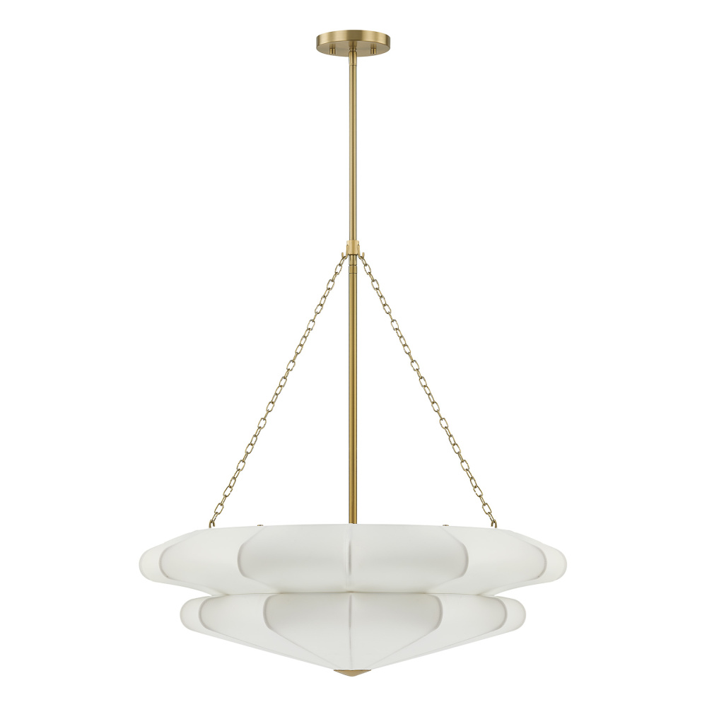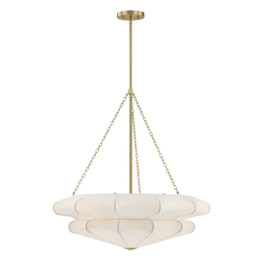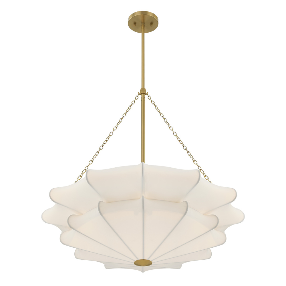 Softly elegant and beautiful, this Savoy House Coppell 3-light pendant is sure to add warm and welcoming illumination to any location. A two-tier white fabric shade opens gently outward, creating a soft silhouette and pairing nicely with the Warm Brass finish. Coppell is 28" in width and has an adjustable height ranging from 27.9" to 81.9". It uses three standard size bulbs of up to 60 watts per bulb. Bulbs not included. Comes with four 12" downrods and one 6" downrod.