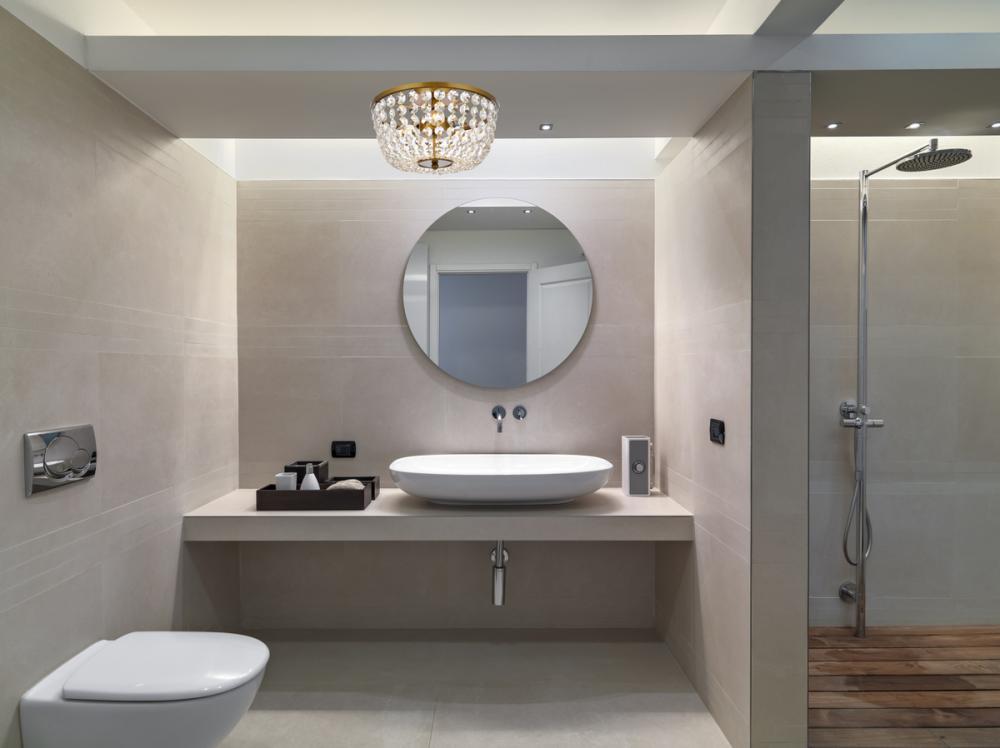 Tiers of clear multi-faceted crystals reflect the soft glow of candelabra bulbs
