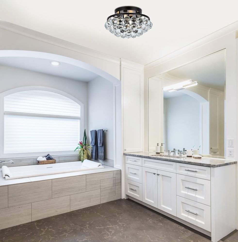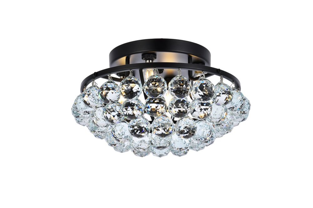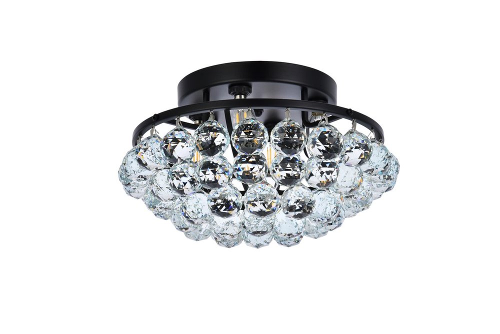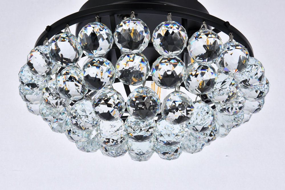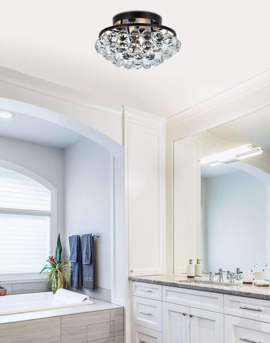 Brimming with sparkle, Corona collection flush mount lamps fill a home with brilliant light. A rounded frame is overflowing with clear crystal balls and faceted prisms. A bejeweled scalloped band at the top is tipped with matching crystal balls to form a gorgeous "crown" of crystals, from which the design gets its name. Available in a black or chrome or gold finish that is dazzling in an entryway, bathroom, or hallway.