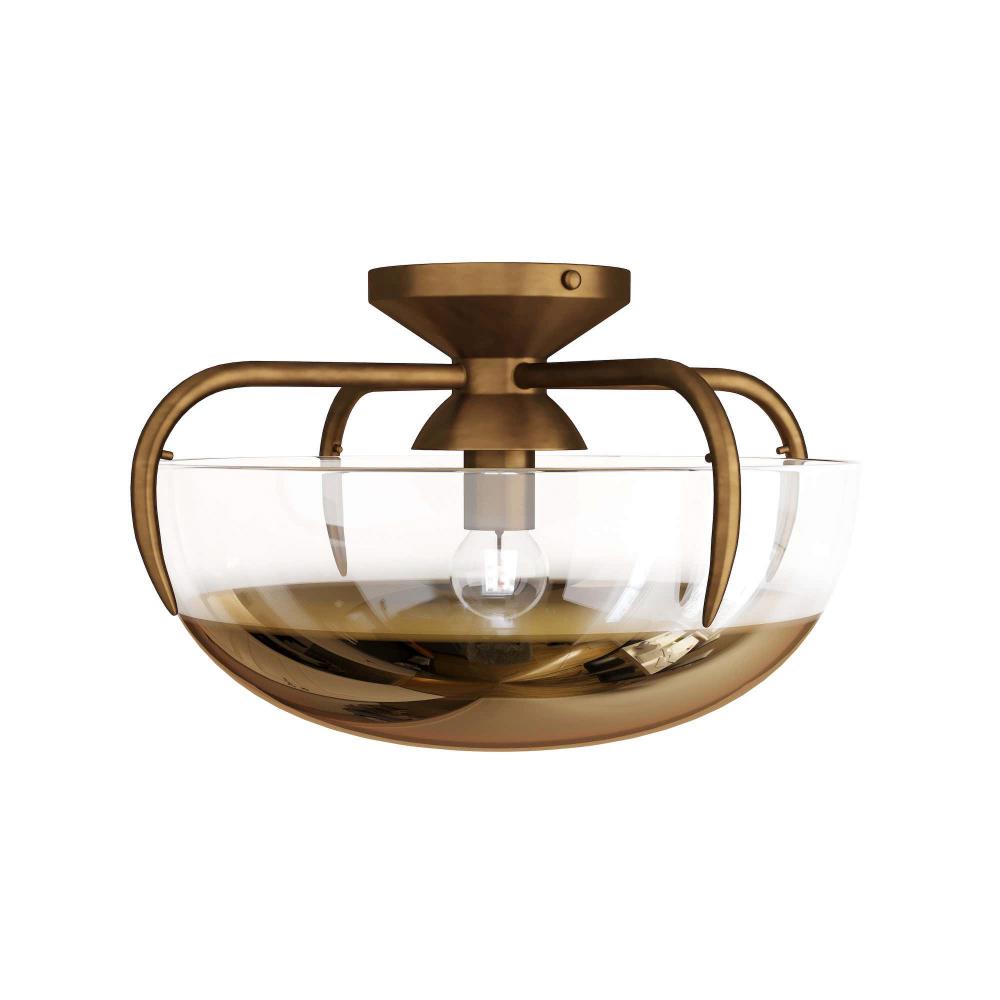 CONTEMPORARY GLAM WITH ORGANIC SENSIBILITIES. THIS SMALL ANTIQUE BRASS FLUSH MOUNT CASTS A LARGE SHADOW AND LIGHT EFFECT ON THE CEILING DUE TO THE GOLD OMBRE GLASS. PERFECT FOR POWDER ROOMS AND HALLWAYS, OR USE IN AN ASYMMETRIC CLUSTER OVER TABLES AND COUNTERS. FINISH WILL VARY.