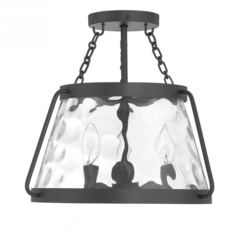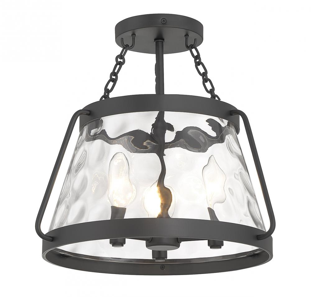 The Savoy House Crawford 3-light ceiling semi-flush mount proves that a classic style can be stunning! A lantern-inspired shade of clear water glass hangs down from an understated structure with industrial-inspired details. Finished in matte black. Crawford is 13.5” in height and 15” in width. It uses 3 candelabra size bulbs of up to 60 watts per bulb (bulbs not included).