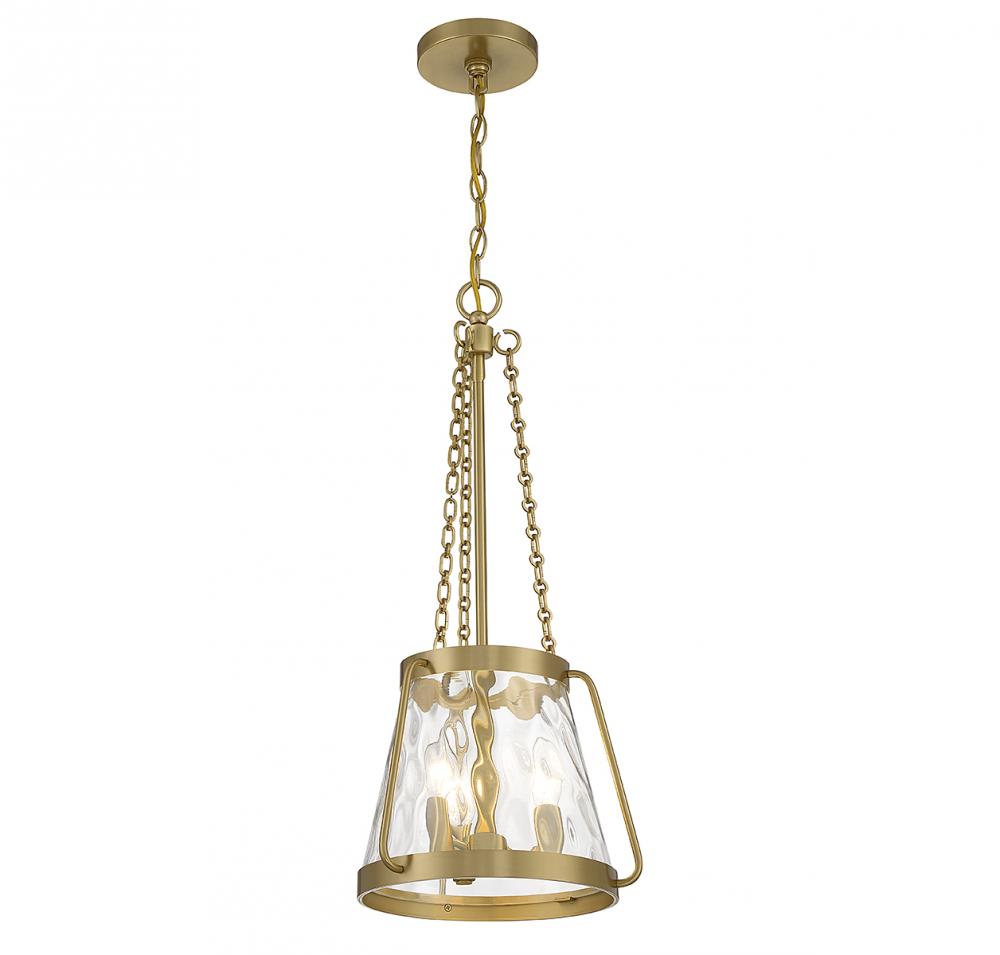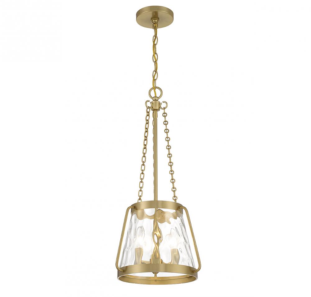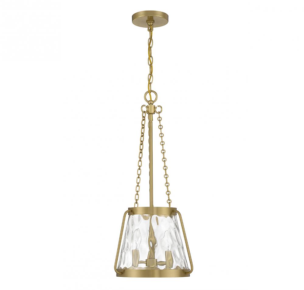 The Savoy House Crawford 3-light pendant proves that a classic style can be stunning! A lantern-inspired shade of clear water glass hangs down from an understated structure with industrial-inspired details. Finished in warm brass. Crawford is 25.5” in height and 12” in width. It uses 3 candelabra size bulbs of up to 60 watts per bulb (bulbs not included).