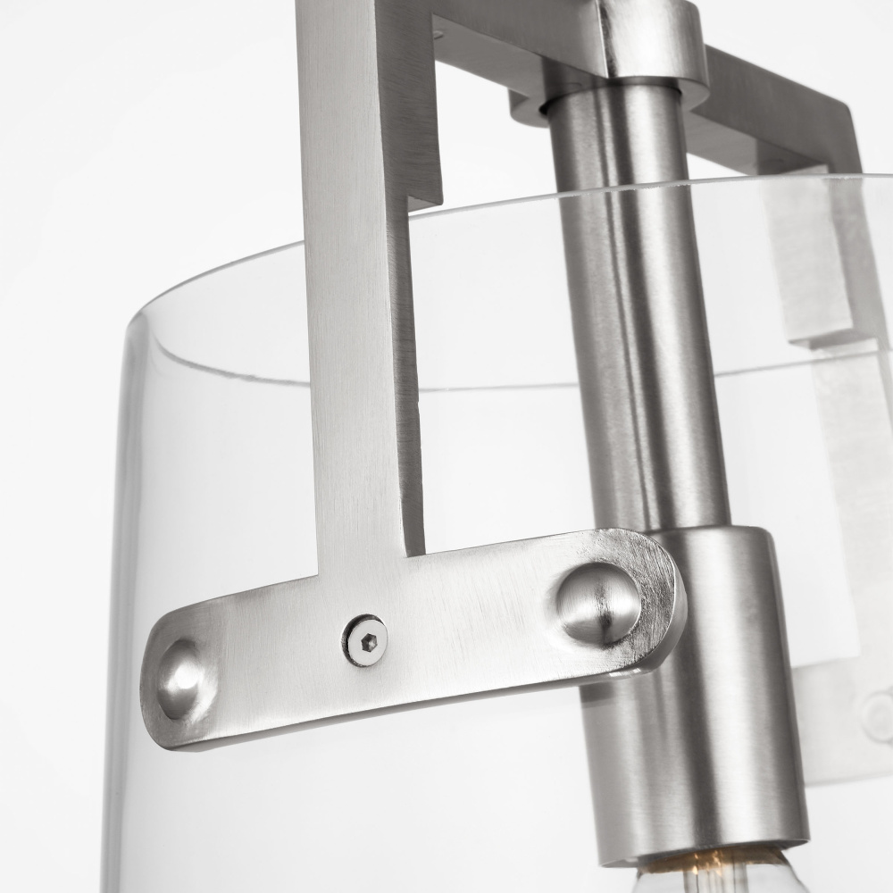Crafted with Steel in a Brushed Nickel finish with clear glass shade