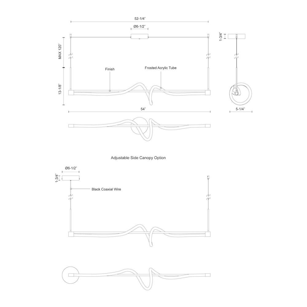 The Cursive linear pendant is a fluid signature of light, formed by an effortless acrylic form dancing around a center rod, suspended by two cables. Available in a black metal finish, this pendant offers soft ambient light diffused by a frosted lens.
