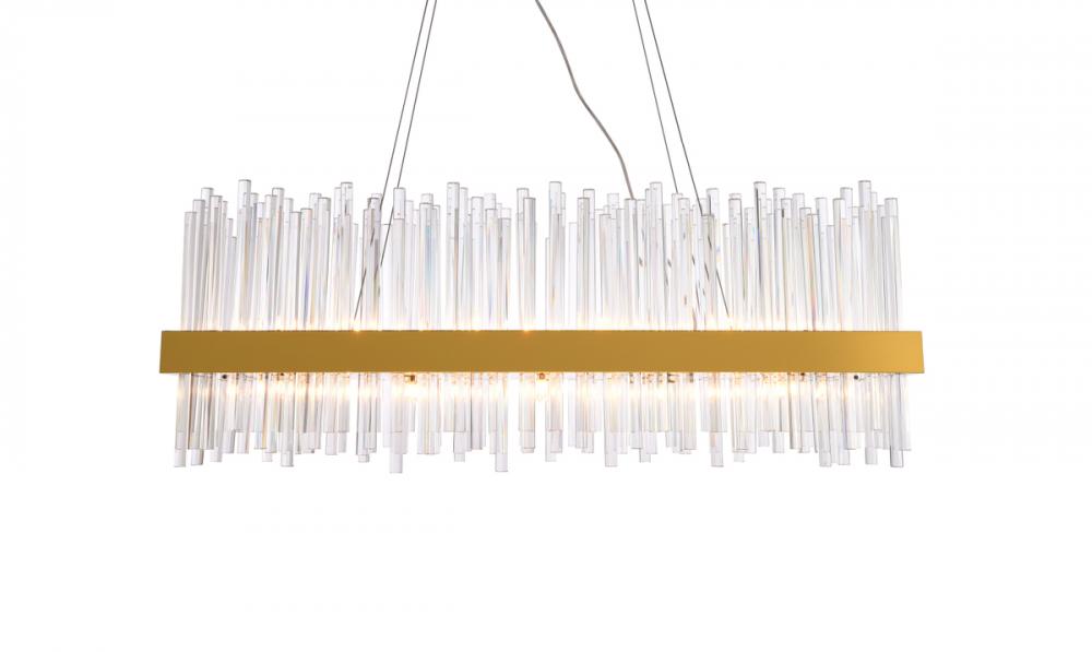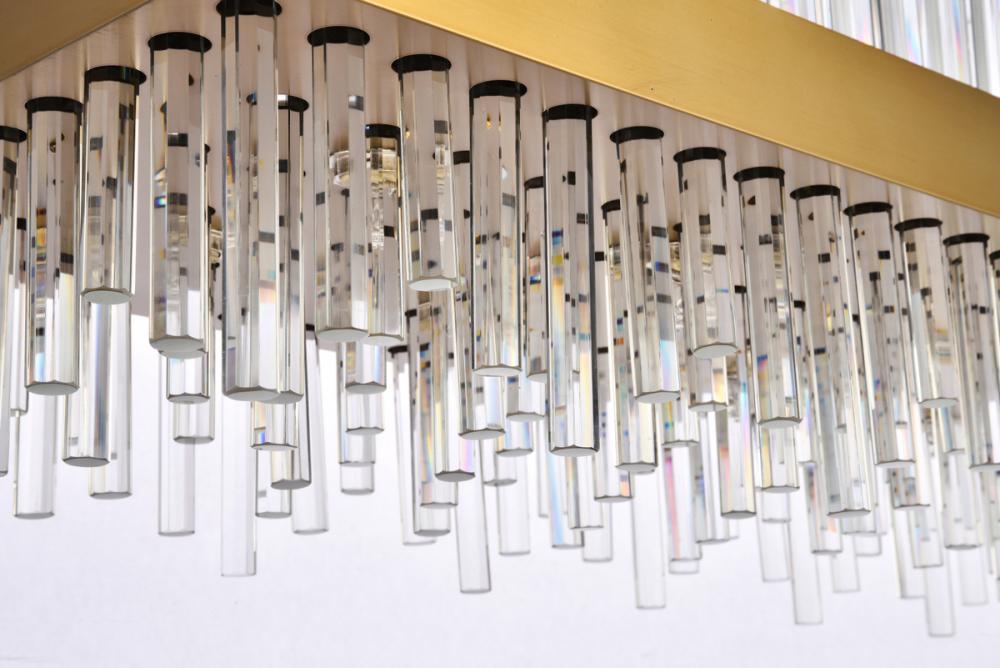 This stately fixture combines timeless elegance with modern and attractive sophistication. The delicate juxtaposition of upright and hanging clear glass rods creates a truly stunning visual statement, seamlessly woven together within a sleek gold frame. This expressive piece would be a welcomed and treasured addition to a wide range of contemporary residential styles.