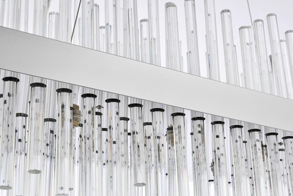 This stately fixture combines timeless elegance with modern and attractive sophistication. The delicate juxtaposition of upright and hanging clear glass rods creates a truly stunning visual statement, seamlessly woven together within a sleek bold metal frame. This expressive piece would be a welcomed and treasured addition to a wide range of modern residential styles.
