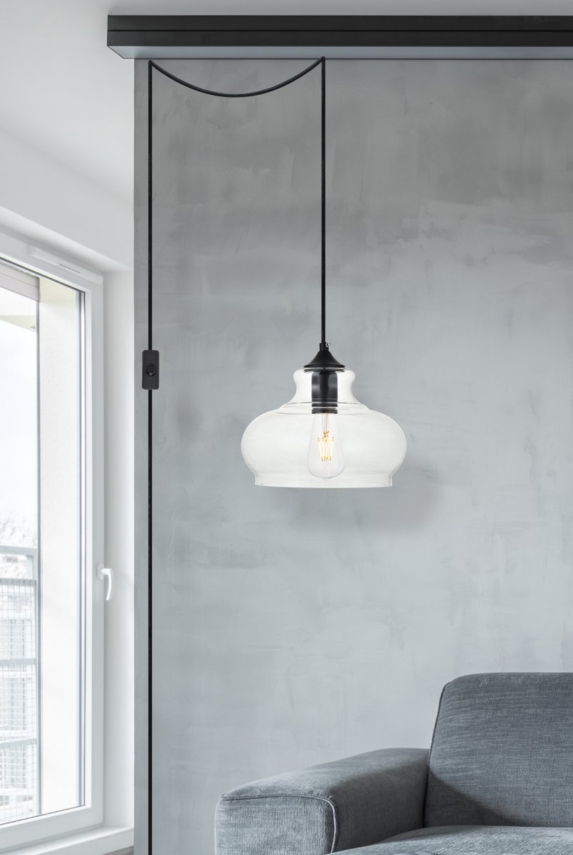 The small, but mighty Destry collection offers sleek pendant lamps that will add a powerful accent to your urban, industrial, or transitional décor. The light’s black hardware finish adds to the interest of the piece. Black 'top hat' design accentuates the clear glass shade. Each black and clear sugar pot shade holds one incandescent or LED light bulb (not included). Brighten your kitchen island, bathroom, entryway, or den with this one-light statement fixture. Plug-in design for easy access lighting with built-in on/off switch. Simply hang this piece on the provided swag hooks and plug it in for an effortlessly easy installation - can be hung from a sloped or vaulted ceiling.