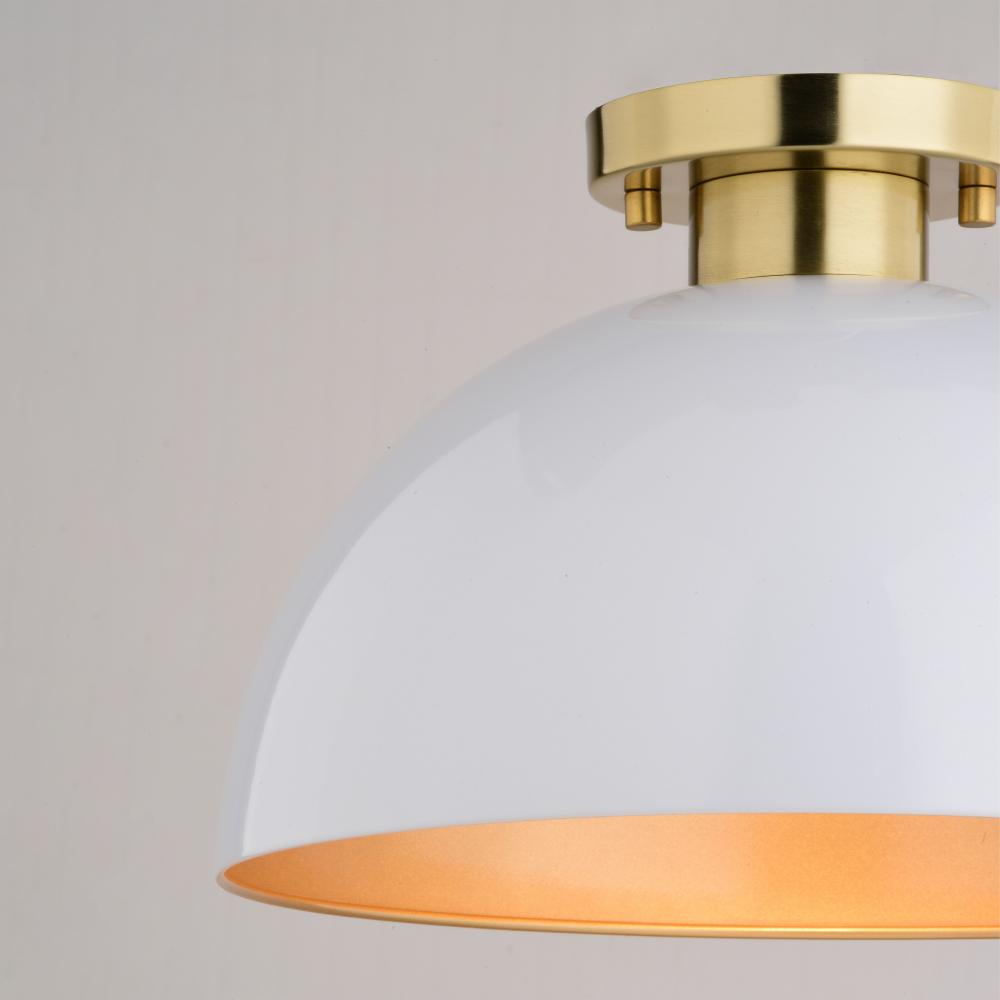 The Devon collection showcases a ceiling light that exudes elegance and simplicity at a great price point. The classic glossy white dome shape is complemented beautifully by gold satin brass accents which adds a luxe touch to the overall design. The golden interior casts a soft glow of focused light and shows off the light's blend of modern minimalism and classic elegance. This ceiling light works well with many mid-century modern and contemporary decors whether it’s your kitchen, breakfast nook, home office or entryway.