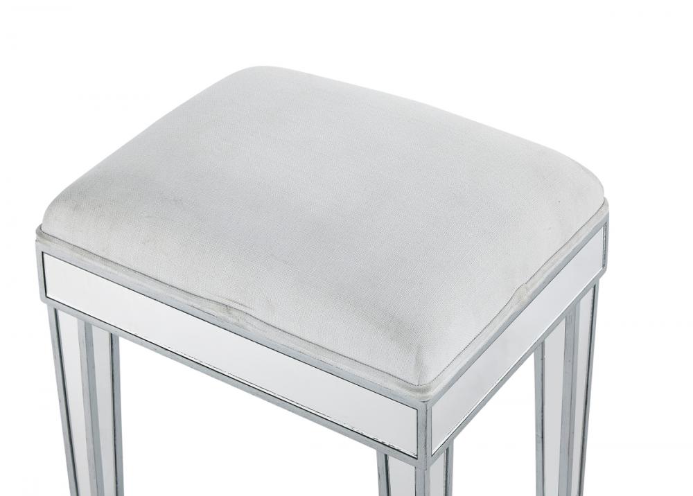 Stylish and versatile, this upholstered stool is perfect for use with a dressing table, desk, coffee table, or a small ottoman. Measuring L18xW14xH18”, this stool is covered by linen and cotton blend fabric, adding a velvety softness and comfort. FEATURES: *Reflexion collection Upholstered with cotton and linen blend *Hand rubbed silver finish *Top-quality mirror panel *Solid wood trim and legs PRODUCT DETAILS: Measurement L18xW14xH18” *Minor assembly required *Material in kiln-dried solid wood and engineered wood * 1 year limited warranty.