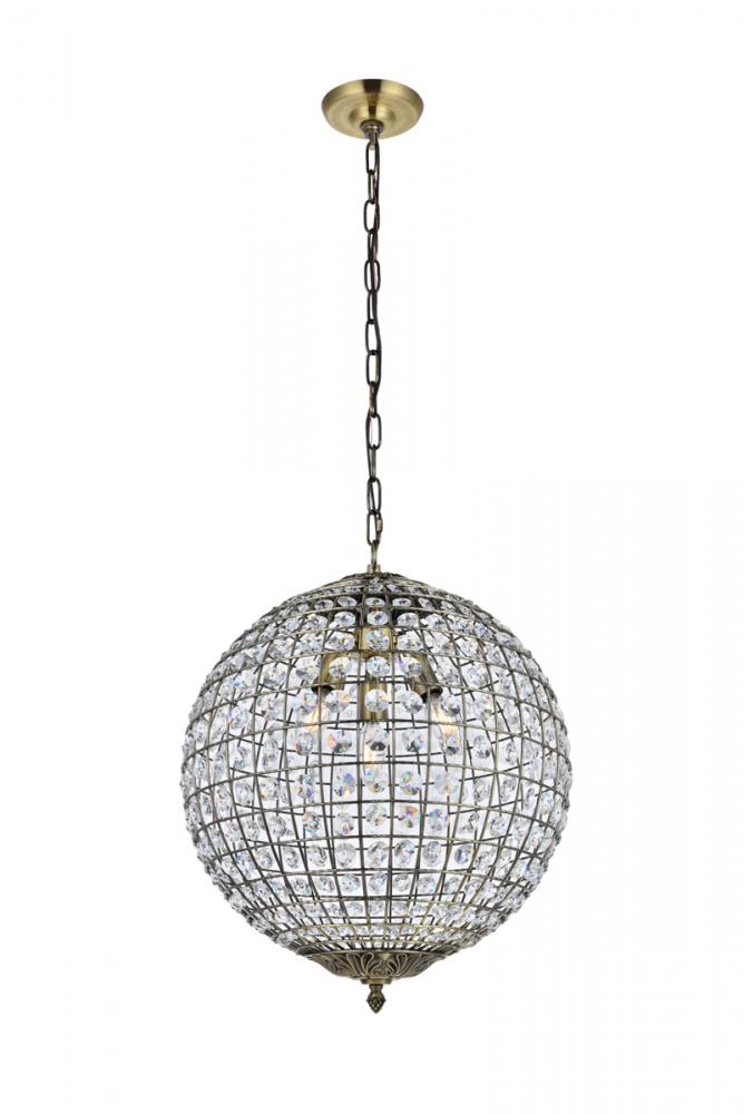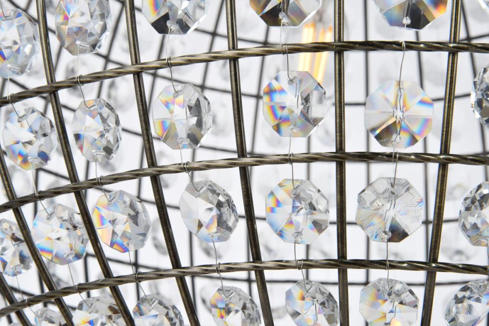 Brighten any room with this celestial globe of radiance, as overhead light bounces and dances off of dozens of octagonal Crystal prisms. The beautiful spherical pendants of the Earlene collection are shaped by latitudinal and longitudinal metal ribs supporting the multifaceted ornaments, capped above and below with bases featuring delicate folds of antique bronze and a distinctive lower finial. The 16-inch-diameter fixture is amply illuminated by three bulbs (not included).