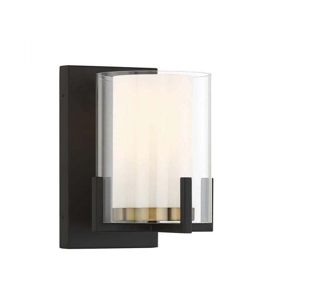 The Savoy House Eaton 1-light sconce has an elegant and appealing look with a shade of clear and white opal glass, jewelry-like prong detailing and a two-tone finish of black and brass. Create the illusion and beauty of candlelight with Eaton! This sconce is 8.25" in height, 6" in width and extends 7" from the wall. Uses one standard size bulb of up to 60 watts. Damp area rated.
