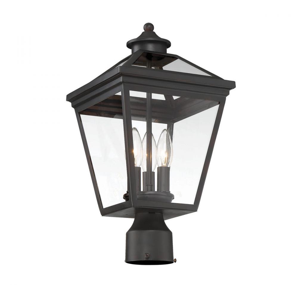 Brighten the exterior of your home and welcome your guests in style with the Savoy House Ellijay 3-light outdoor post lantern. The design mimics a vintage gas lantern with a classic tapered box shape and decorative top finial. A sumptuous English bronze finish adds traditional flair and blends well with other hardware and architectural materials. Panes of clear glass fill all four side panels and the roof panels, too. Three 40W candelabra size bulbs provide inviting and secure illumination. This lantern measures 9" wide and 17.5" high.