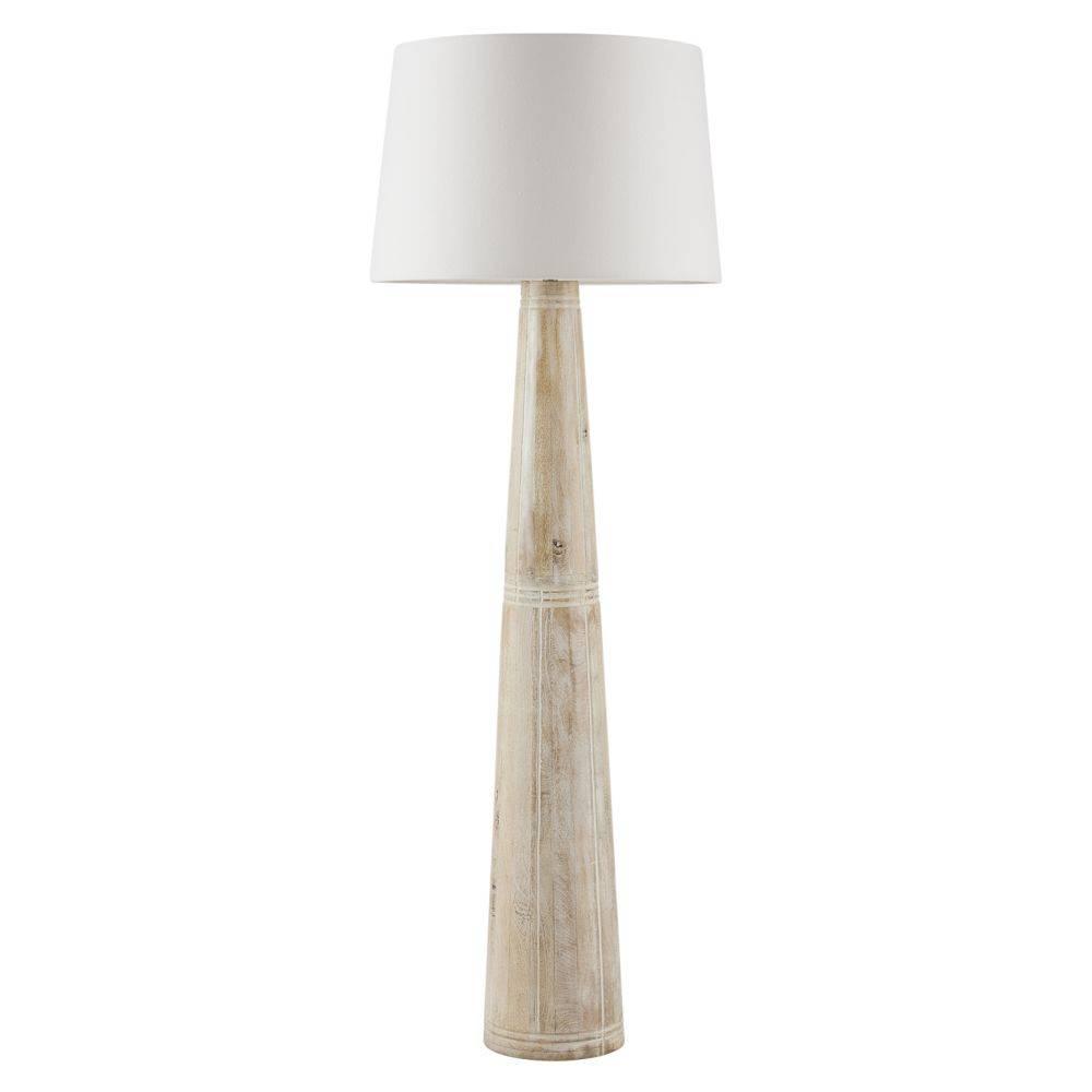 The etched paths of a busy cityscape inform our conical floor lamp. Crafted of mango wood whitewashed to bring out the intersection of lines in the tapered base, it is punctuated with an oversized linen drum shade in off-white and a matching mango wood finial. Clear plastic cord. Finish will vary.
