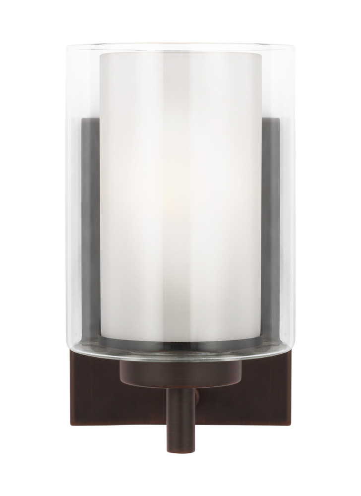 The Elmwood Park one light wall sconce in bronze provides abundant light for your bath vanity, while adding a layer of today's style to your interior design. Elmwood Park by has clear glass tube shades with an inner white glass element that softens the light and helps cast an even glow. A cylinder of etched glass is centered within a larger cylinder of clear glass which encircles each light bulb to create this stunning visual effect. The full assortment includes three-, five-and nine-light chandeliers, a four-light linear, one-light mini pendant, a three-light pendant, a two-light semi flush which is convertible into a pendant, and one-, two-, three- and four-light bath fixtures. All fixtures offered in either a Brushed Nickel or Brushed Oil Rubbed Bronze. Incandescent and ENERGY STAR-qualified LED lamping are available; all fixtures are California Title 24 compliant.