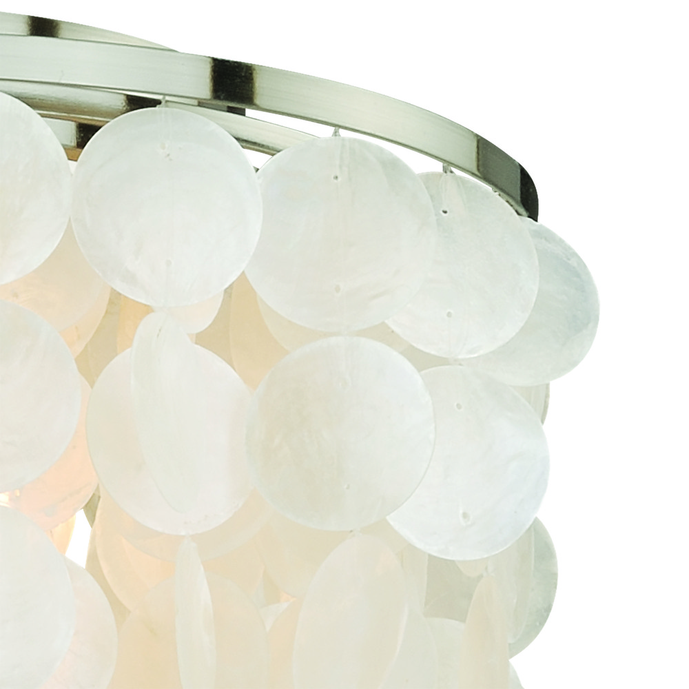 Soft contemporary styling combined with texture and iridescence. This fixture is a unique option to lighten and liven up your hallway, bedroom, or low-ceiling entryway. Tiers of hand-strung natural Capiz shells create a soft diffused light that perfectly compliments the satin nickel metal elements. This is a full collection with coordinating pieces to decorate any room in the house. Features candelabra lamping, frosted bulbs recommended for best appearance.