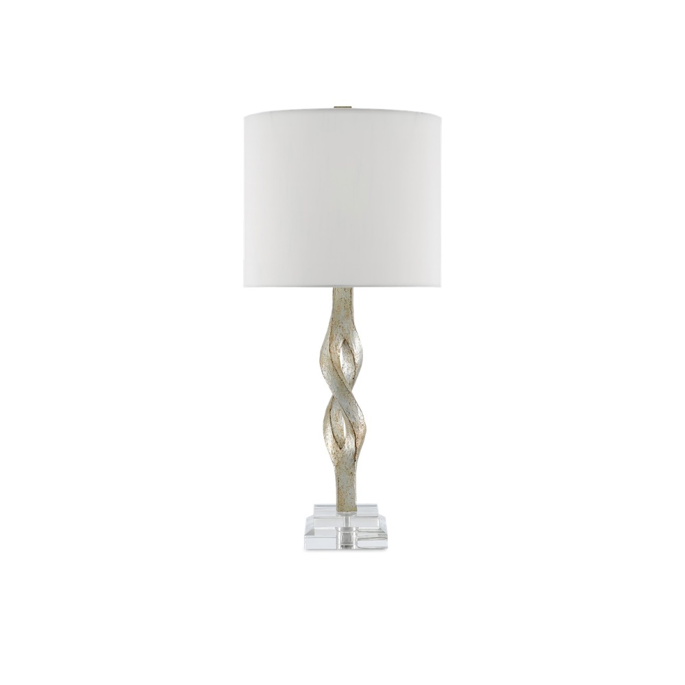 The Elyx Table Lamp may read like a brawny twist of heavy metal but the real twist to this design is that it is made of composite so it is a light and airy version of the inimitable metal beam. This is one of our design team�s original hand-sculpted pieces, which has been treated to a silver leaf finish for extra sheen. Enhancing the lightness of the design is an acrylic base and an off-white shantung shade. The lamp will enliven any corner of a room with its slight-of-hand.