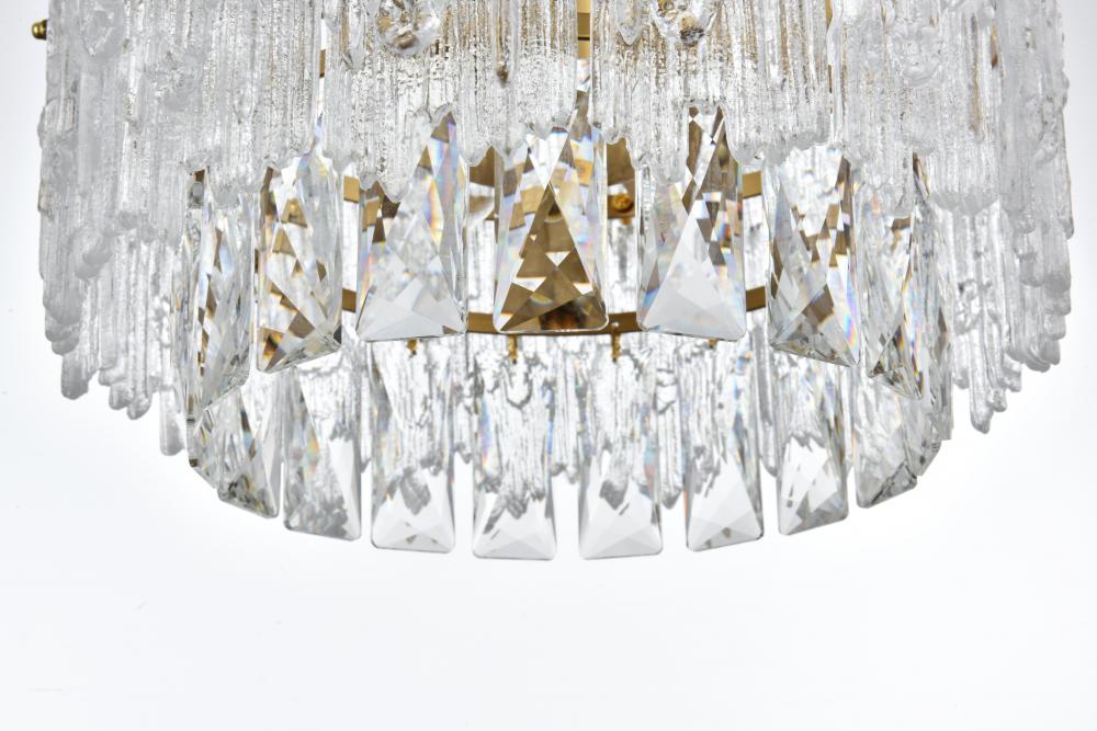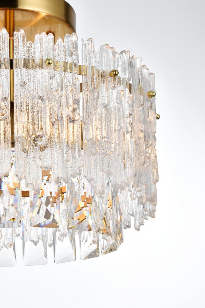 The combination of clear crystals and textured glass creates a sophisticated light play, perfect for setting an elegant mood.