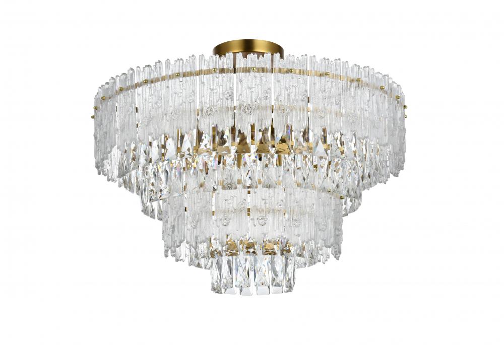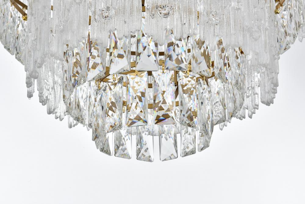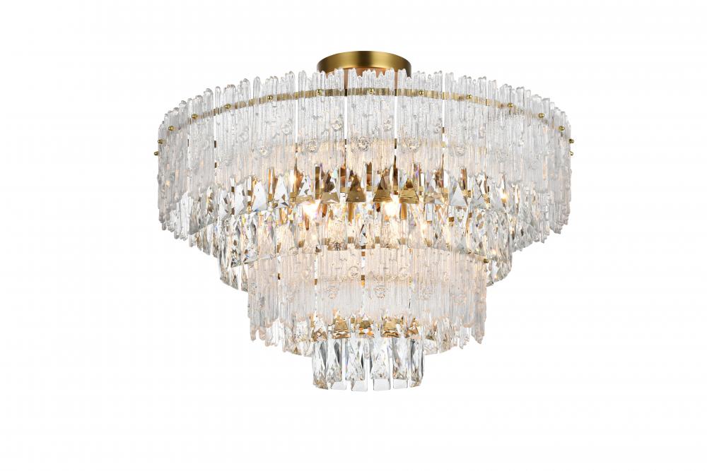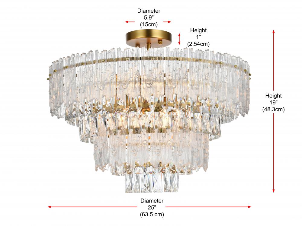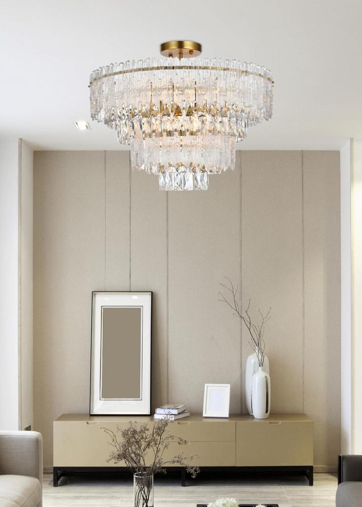 Transform your home with the opulent charm of this indoor lighting, meticulously designed to make a statement in any space. The light fixture showcases an intricate array of precision-cut clear crystals, each expertly faceted to maximize light refraction and create a dazzling display of brilliance. These crystals are complemented by textured glass accents that add depth and visual interest, casting a soft, shimmering glow across the room. Available in your choice of chrome or satin gold finishes, it is the epitome of luxury and modern elegance. As part of a coordinated collection, it also includes matching chandeliers, wall sconces and flush mounts, allowing you to create a harmonious lighting scheme throughout your home.
