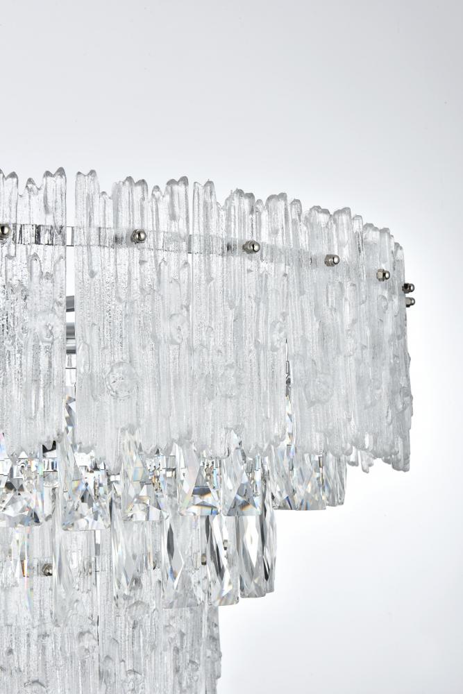 Transform your home with the opulent charm of this indoor lighting, meticulously designed to make a statement in any space. The light fixture showcases an intricate array of precision-cut clear crystals, each expertly faceted to maximize light refraction and create a dazzling display of brilliance. These crystals are complemented by textured glass accents that add depth and visual interest, casting a soft, shimmering glow across the room. Available in your choice of chrome or satin gold finishes, it is the epitome of luxury and modern elegance. As part of a coordinated collection, it also includes matching chandeliers, wall sconces and flush mounts, allowing you to create a harmonious lighting scheme throughout your home.