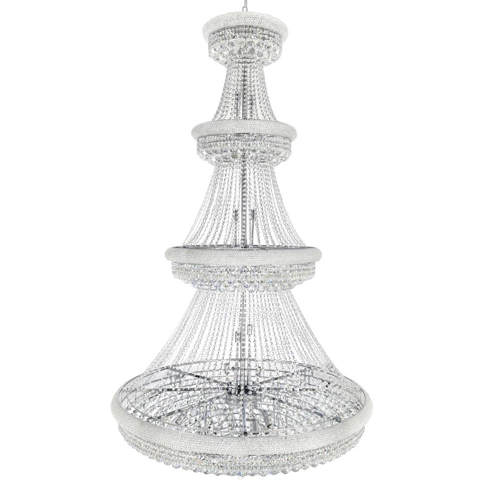 The Empire 42-Light Chandelier redefines luxury lighting with its imposing four-tiered structure and cascading crystal drapes. This 50" masterpiece channels the sleek sophistication of urban architecture while bathing your space in radiant, layered light. The chrome-finished frame creates dazzling reflections, making it perfect for elevating formal dining rooms, grand foyers, or event spaces. More than just a light source, this chandelier is a transformative design element that commands attention and elevates every occasion. Finish: Chrome with Crystal Draping Bulb Type: 42 x E12 Candelabra (Bulbs Not Included) Warranty: 1 Year Style: Modern Glam/Architectural Installation: Hardwired, Ceiling Mount (Professional Recommended) Best For: High ceilings (10+ ft recommended)