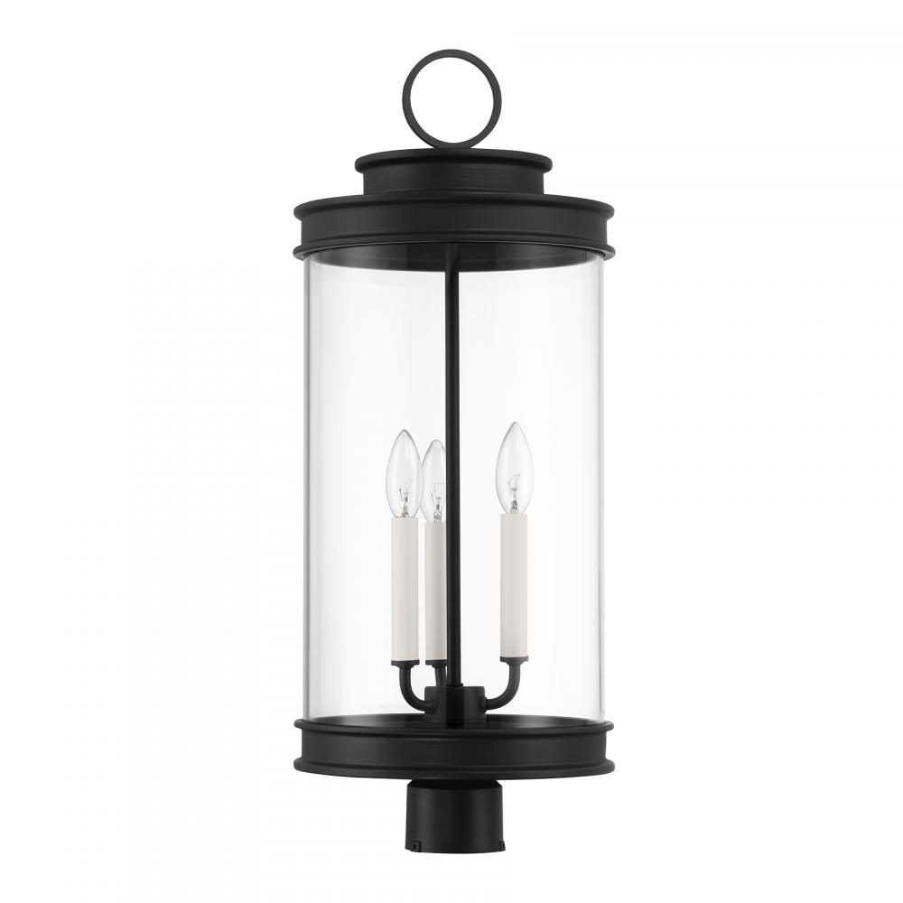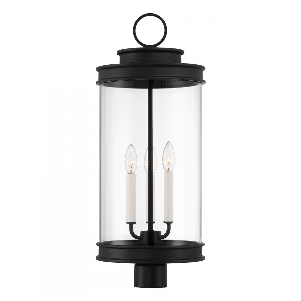 Classic lantern style gets a fresh new look in the Savoy House Englewood 3-light outdoor post light. A beautiful cylinder of clear glass is held in a minimally detailed frame finished in timeless Matte Black. White candle covers create a perfect pairing with the finish. Englewood is 26" in height and 10.5" in width. Uses three candelabra size bulbs of up to 60 watts per bulb. Bulbs not included. Wet area rated.