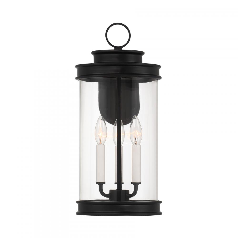 Classic lantern style gets a fresh new look in the Savoy House Englewood 3-light outdoor wall light. A beautiful cylinder of clear glass is held in a minimally detailed frame finished in timeless Matte Black. White candle covers create a perfect pairing with the finish. Englewood is 19" in height, 8.5" in width and extends 11" from the wall. Uses three candelabra size bulbs of up to 40 watts per bulb. Bulbs not included. Wet area rated.