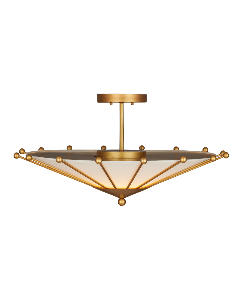 The Epoch Semi-Flush Mount features mid-century modern design elements, with a frame made of wrought iron in a contemporary gold leaf finish. The geometric elements on the frame elegantly clasp the fabric shade, creating a sophisticated look. The shade sits inside the bottom cone on the beige and gold semi-flush mount, and the ribs of metal that hold the shade in place culminate with ball shapes just beyond the fabric's edge.