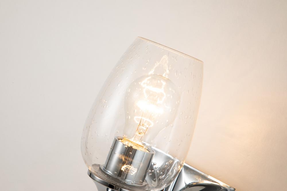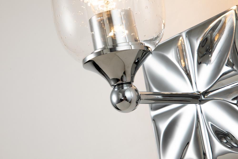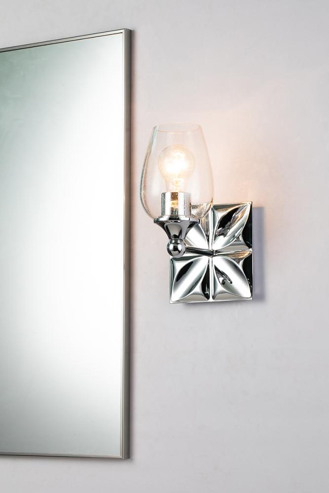 A 6" textured square backplate sconce in polished chrome with a wine glass-shaped seeded glass shade. Mounts up or down, offering modern elegance and texture to any room.
