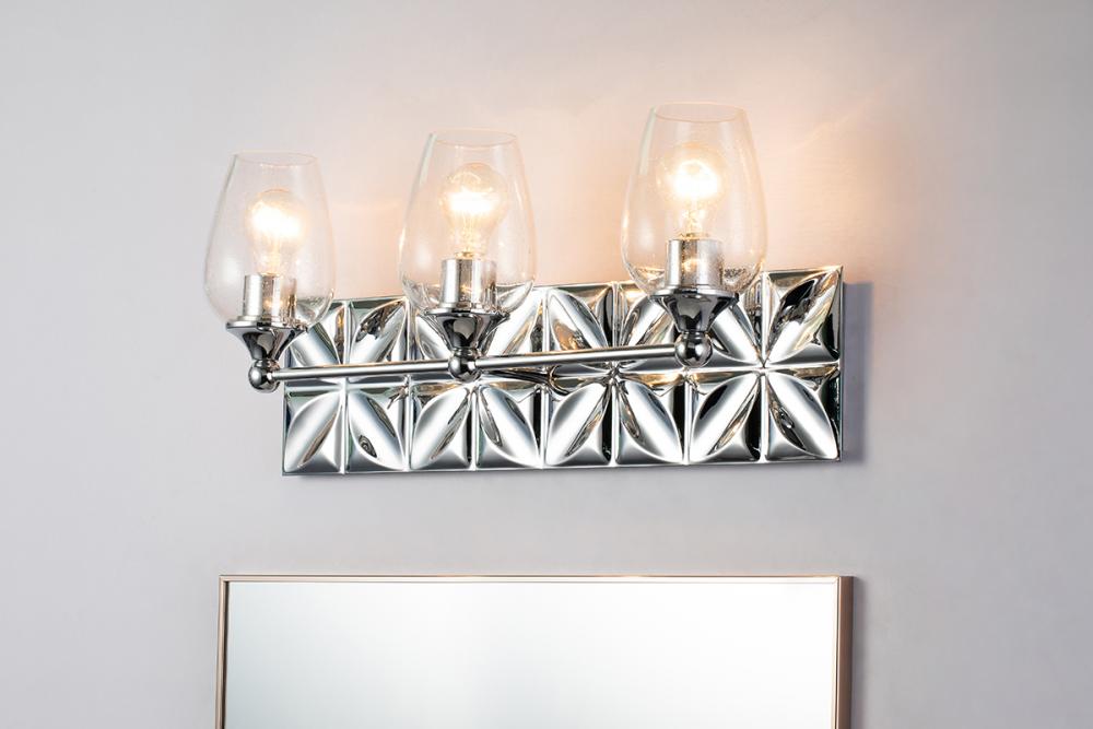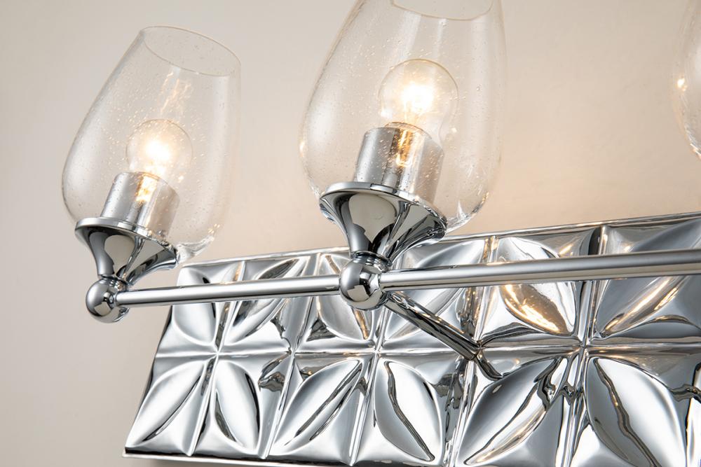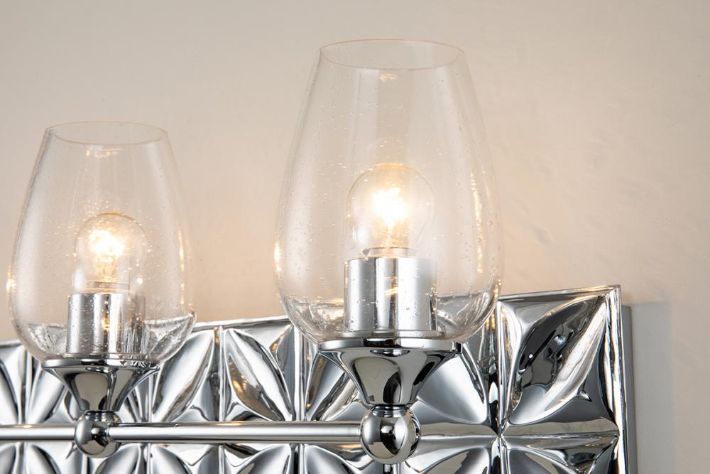 A 24" textured backplate vanity light in polished chrome with three wine glass-shaped seeded glass shades. Mounts up or down, blending modern elegance and texture for bathrooms.