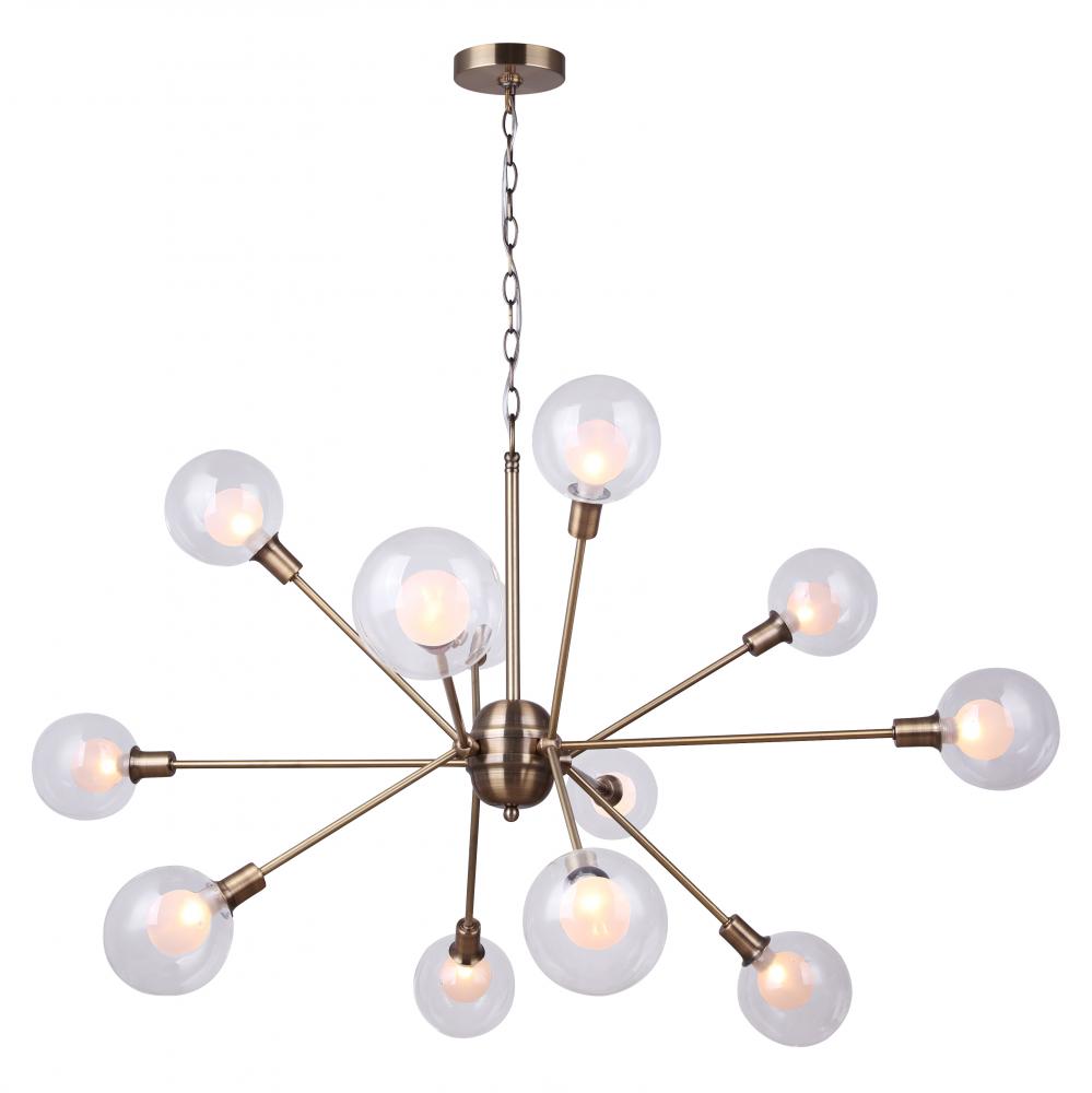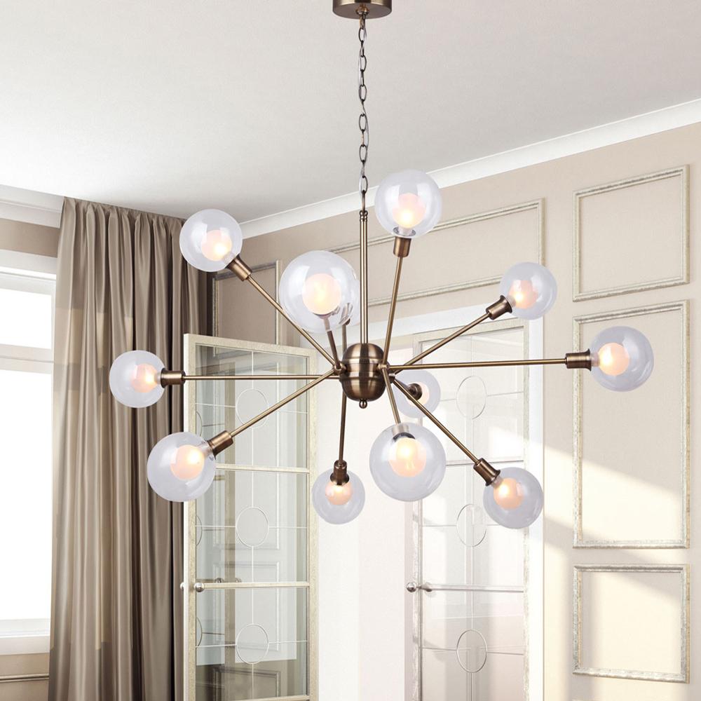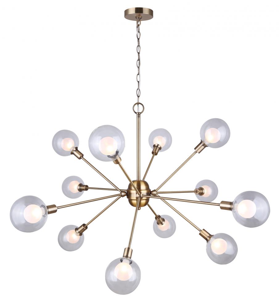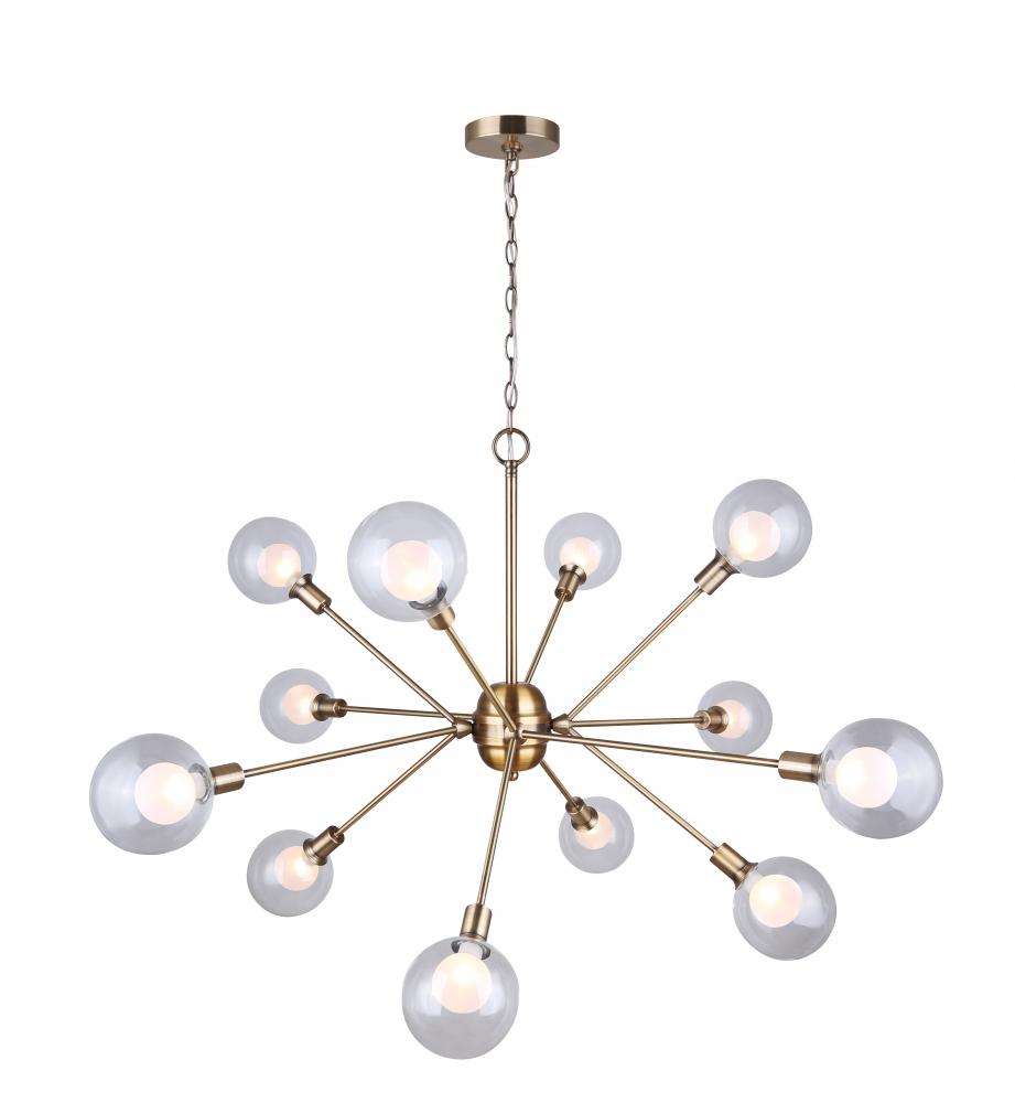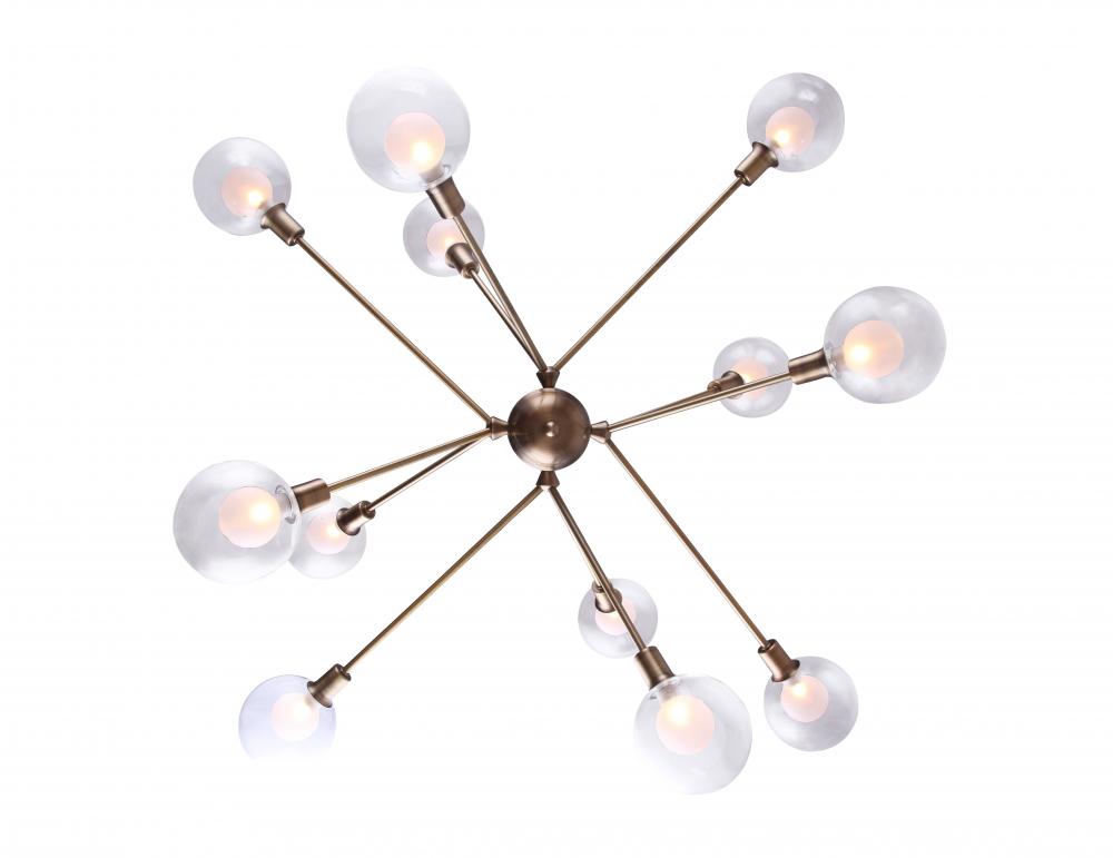 In the Orbit of Avant-Garde EleganceImagine, if you will, a time when the world stood on the brink of the future, gazing eagerly into the vast expanse of the unknown. The Estella 12 Light Chandelier is born of this moment, a masterpiece that captures the audacious spirit of the Atomic Age blended with the undeniable glamour of mid-century modern design. Its gold finish is not just a color; it's a statement—a declaration of boldness, of innovation, and of unparalleled elegance.A Constellation of LightSuspended in the air, the Estella Chandelier is more than a source of illumination; it is a constellation within your grasp. Each of its twelve lights, encased in double glass—clear on the outside, frosted within—casts a glow that is both soft and striking, a beacon of avant-garde innovation that transforms space and time with its unforgettable ambiance.