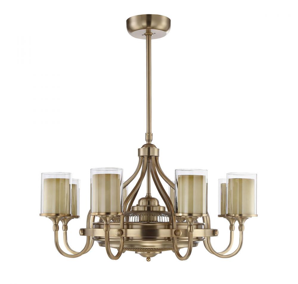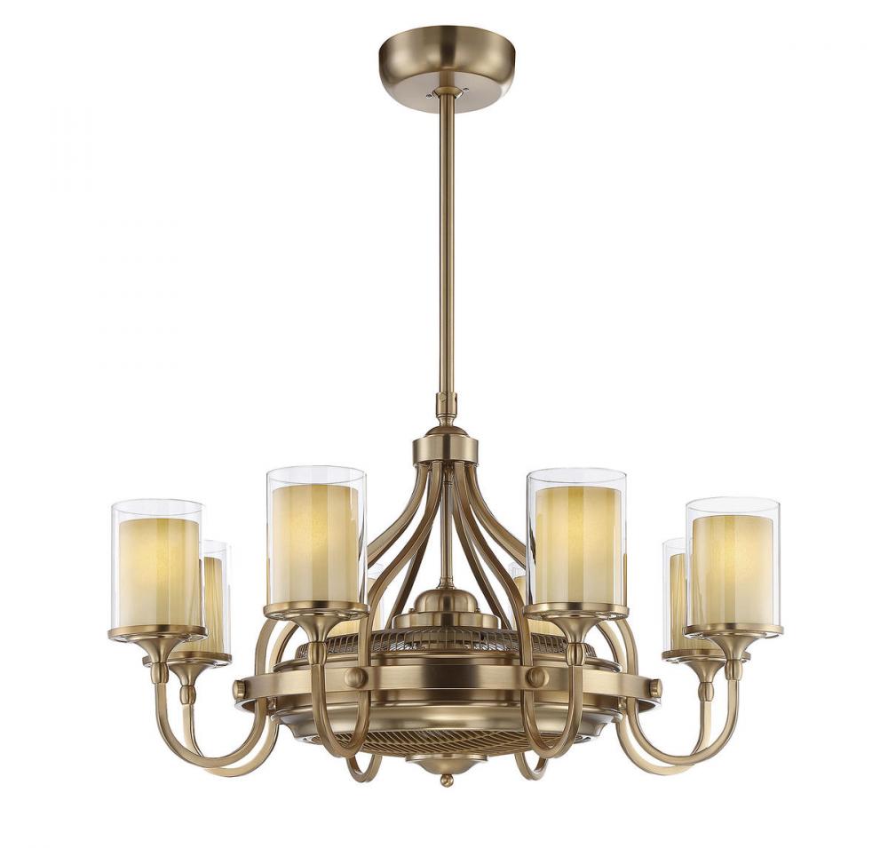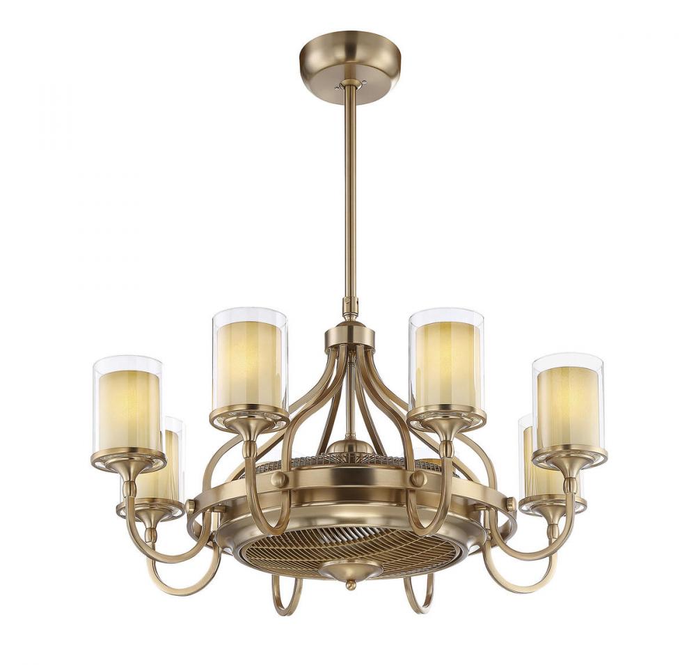 When you’d like both a stylish chandelier and the cooling comfort of a ceiling fan, choose this Etesian fan d’lier. It’s the perfect combination of practical function and beautiful design for your home. Six graceful, curved arms hold elegant streamlined candle cups, with nicely decorative details. The circular fan housing has a refined, two-tier design and delightful finial and canopy. And the entire structure has a gorgeous burnished russet finish. The six shades are beautiful, too: each has an outer cylinder of clear glass and an inner cylinder of cream-colored glass —allowing glare-free illumination from the included 6W, dimmable LED bulbs. A full function handheld remote is also included, so you have independent control of the light and fan.