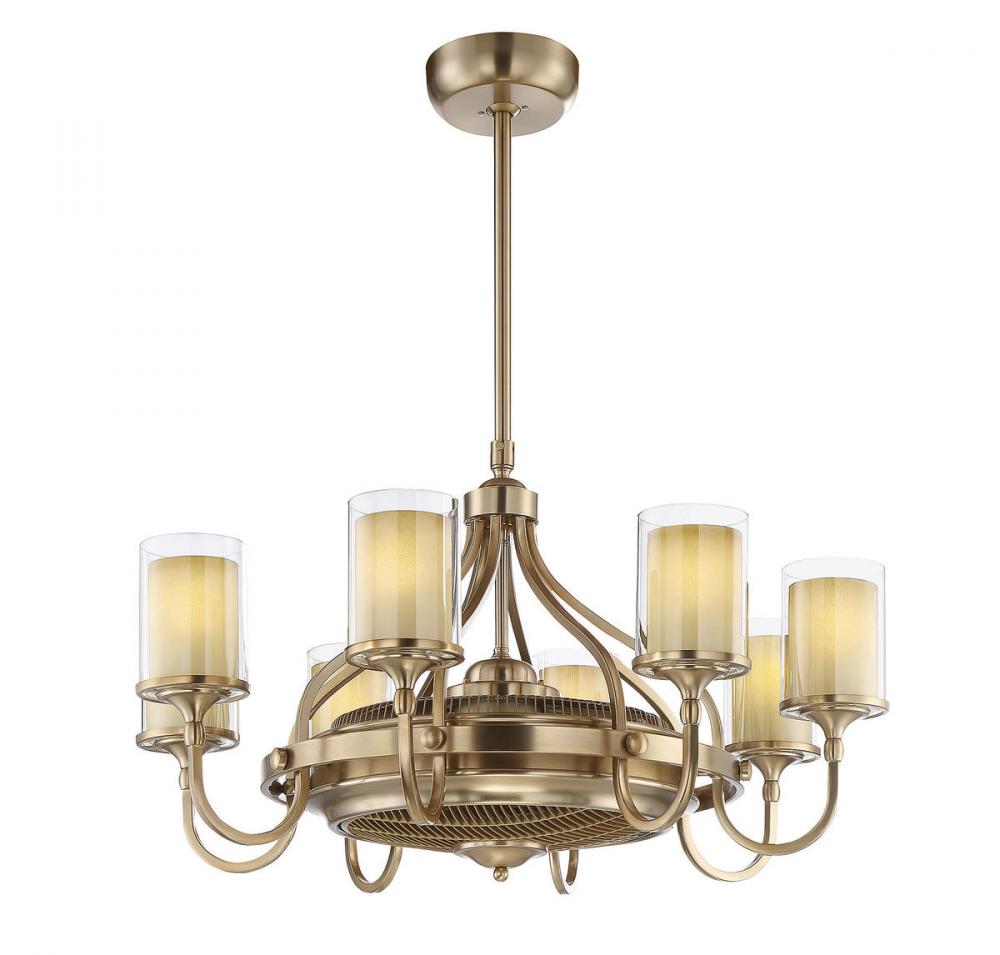 When you’d like both a stylish chandelier and the cooling comfort of a ceiling fan, choose this Savoy House Etesian Fan D'Lier. It’s the perfect combination of practical function and beautiful design for your home. Six graceful, curved arms hold elegant streamlined candle cups, with nicely decorative details. The circular fan housing has a refined, two-tier design and delightful finial and canopy. The entire structure has a gorgeous burnished russet finish. The six shades are beautiful, too, with outer cylinders of clear glass and inners cylinder of cream-colored glass allowing glare-free illumination from the included 6W dimmable LED bulbs. A full function handheld remote is also included, so you have independent control of the light and fan.