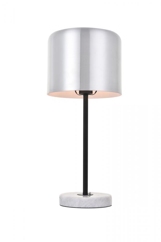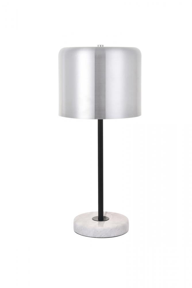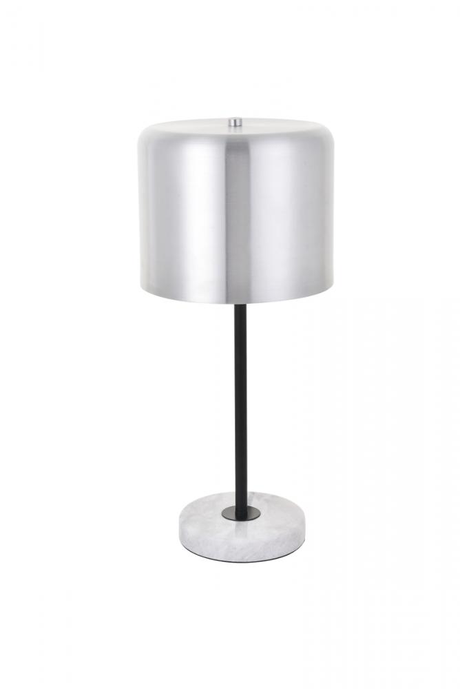 Contemporary brushed nickel finish table lamp with a cylinder shaped shade and white carrera marble base