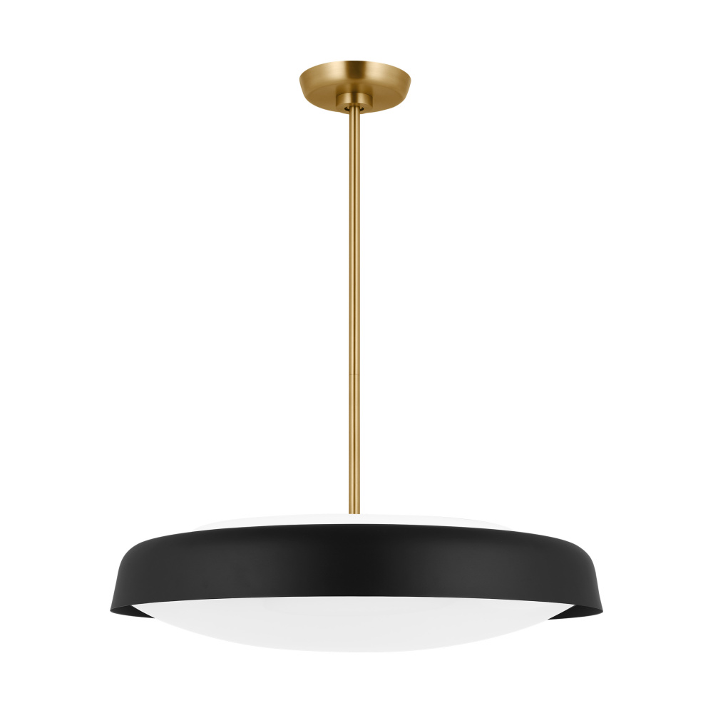 Modern and industrial elements meet in the Draper series, a metal shade that rests atop Milk glass to complete the look