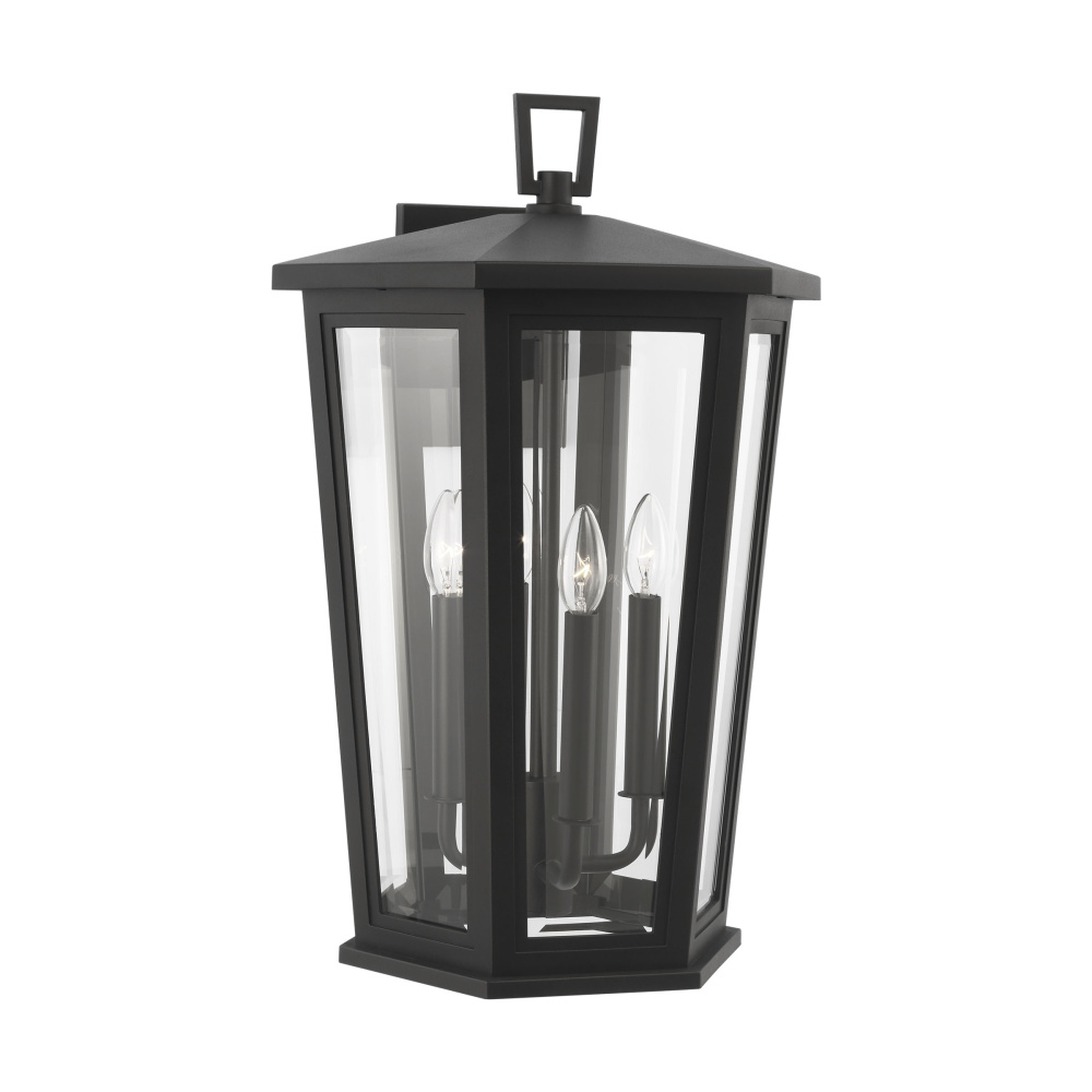The Witley outdoor series by Sean Lavin Lighting is reminiscent of traditional outdoor oil lanterns with several individual panes of glass coming together to create facets that catch the light. Generous proportions in the Textured Black finish and Clear Beveled glass provide generous illumination to welcome guests and brighten passageways. The assortment includes mini, small, medium, large, and extra-large outdoor wall lanterns, a medium pendant, and a 3-light outdoor post lantern.
