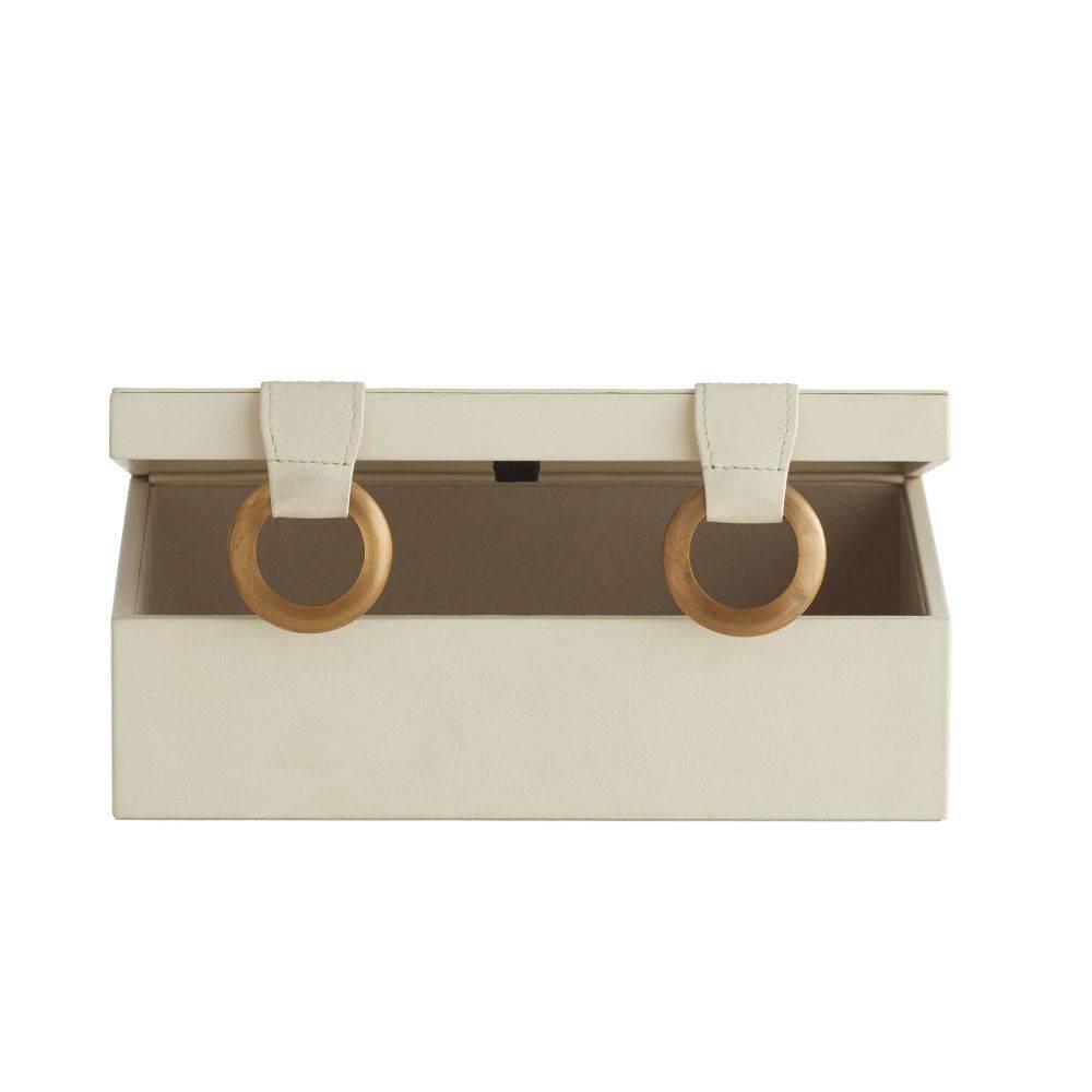 This equestrian keepsake box possesses a tailored balance of masculine and feminine styles. Made of ivory leather with a sumptuous suede interior, it features a hinged lid and is accented with double harness straps finished with antique brass pulls. Finish will vary.