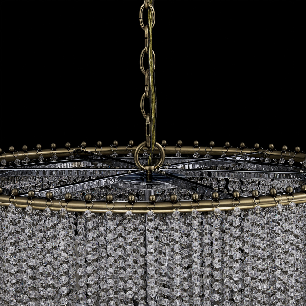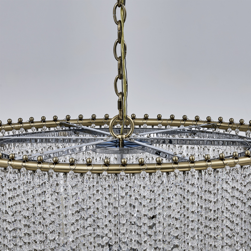 Waterfall crystal drapes over the mainframe is a unique design feature of this wedding cake style crystal chandelier