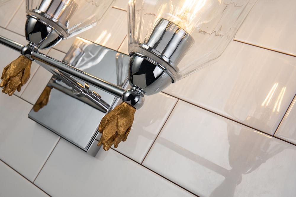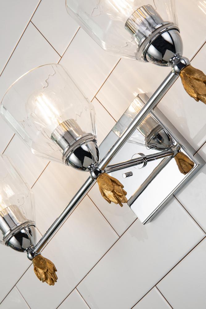 The Felice 3-Light Vanity Sconce blends classic and modern design with a polished chrome finish, gold finial, and dome-shaped glass shade. Perfect for bathrooms or artwork, its timeless style adds elegance to any space. Damp-rated and easy to install.