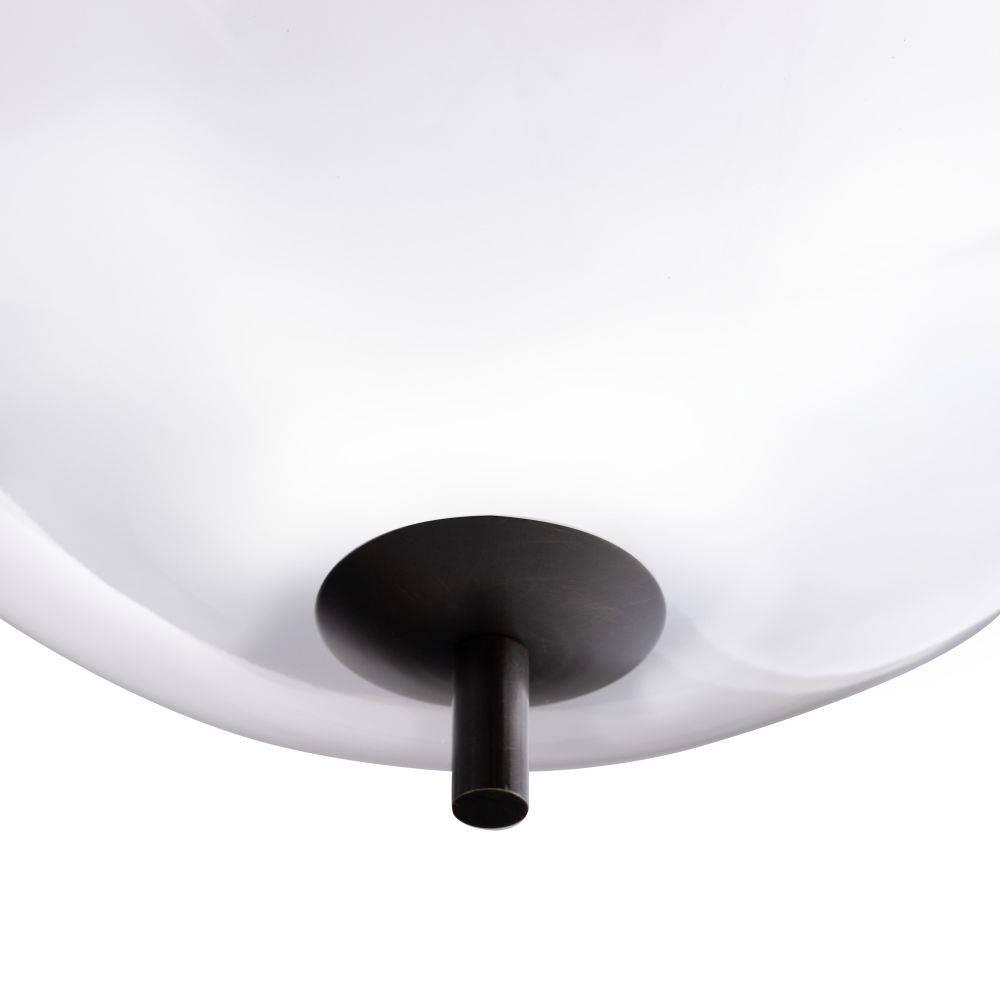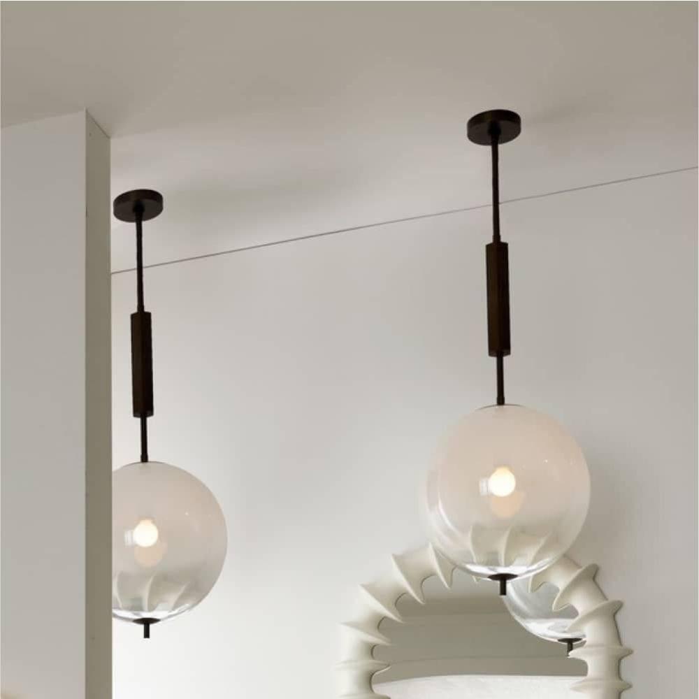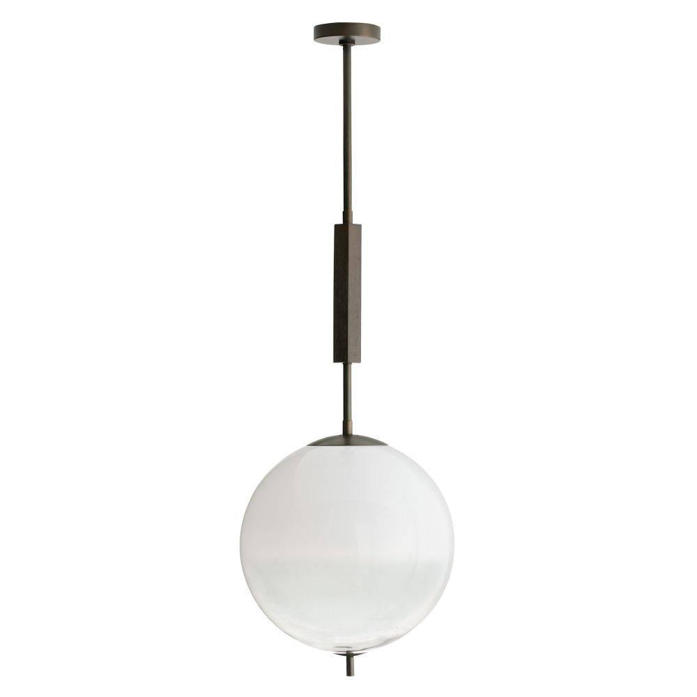 We created this architecturally inspired lamp with a subtle nod to 1970’s-style modernism. A large-scale orb shade of our new frost ombre glass is balanced between English bronze-plated steel hardware, while a faceted wood cuff detail draws the eye upward. Stellar on its own, it is even more impactful when installed in multiples. Damp-rated, although limited covered outdoor areas may affect finish. Finish will vary.
