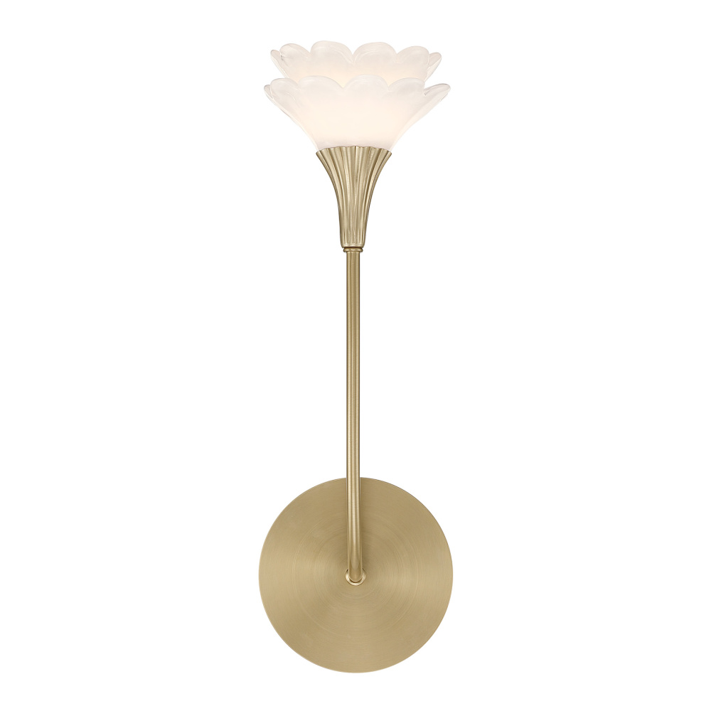 The Savoy House Florena 1-light sconce was designed by award-winning interior designer and TV host Breegan Jane. Two handmade pearlescent white glass flowers rest delicately on a gently curving arm, as if blooming directly from the wall. Their soft luminosity pairs beautifully with the Noble Brass finish, creating a glow that feels tender, artful, and ethereal. Florena is 16.5" in height, 5.38" in width and extends 6.5" from the wall. It uses one G9 bulb of up to 6 watts. Bulb not included. Damp area rated.