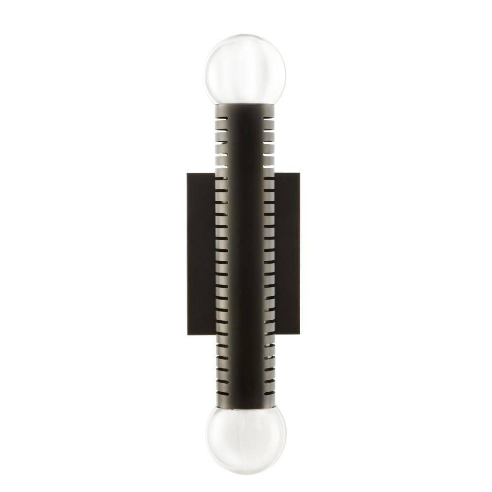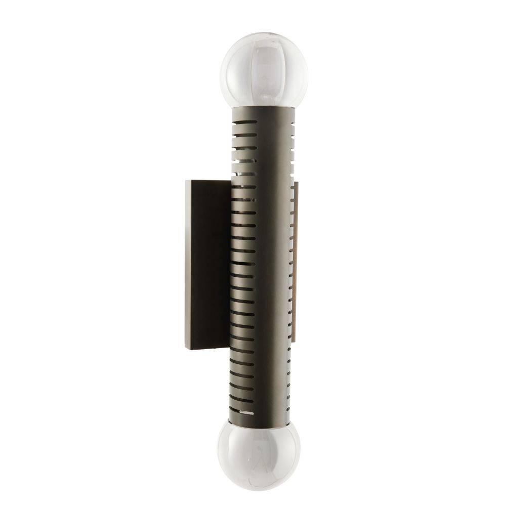 Our English bronze-plated steel sconce with a pair of smoke crystal ball has a handsome machined look that is even more eye-catching when paired or tripled. Its balance of linear and round elements lends an architectural presence to a hallway or corridor, while slotted perforations allow for an enchanting bleed of light. Damp-rated, although limited covered outdoor areas may affect finish.