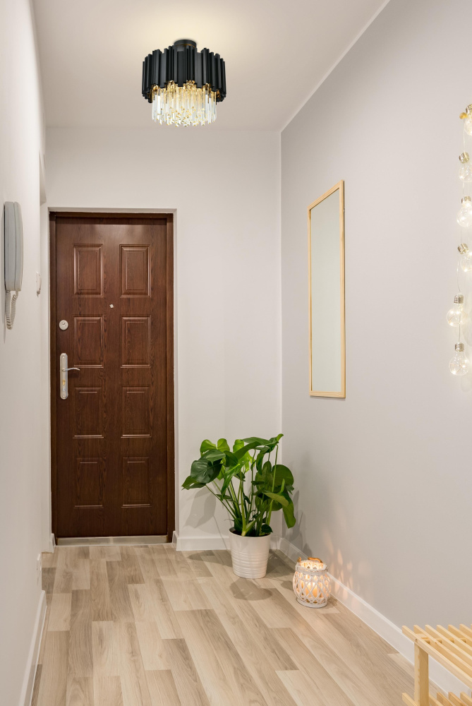Transform your ceiling into a work of modern art with this flush mount chandelier, where bold geometry meets radiant brilliance.