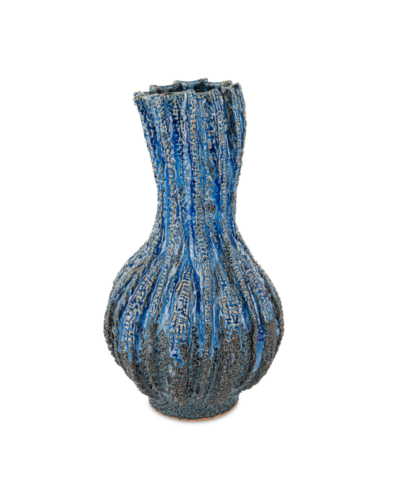 The Folio Vase is made of dark clay ceramic with a tremendous amount of texture. Not only is each indention pressed into it by hand, the stippling on the raised portions are extremely nubby. The organically shaped vase is thrown and carved before the dark blue reactive glaze is applied, a lighter blue falling glaze accentuating the valleys to make each vessel unique. The vase stands 17 inches tall.
