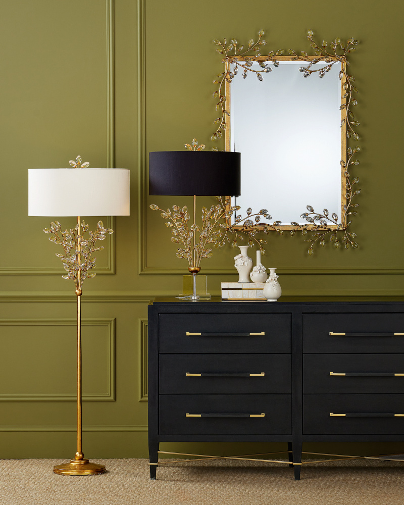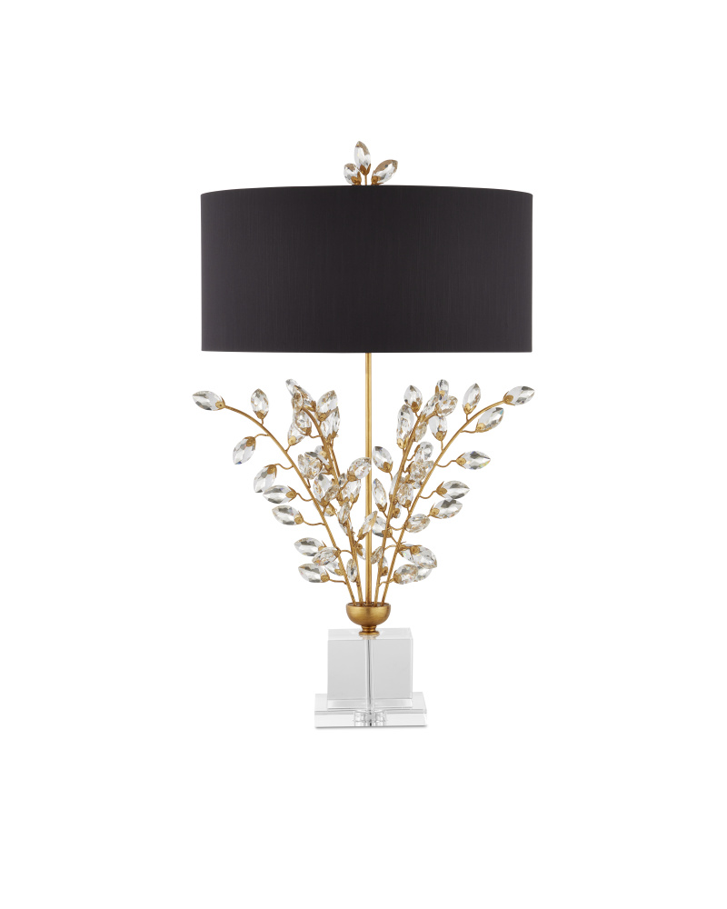 On stems of metal that have been treated to a rich Chinois gold leaf finish, a spray of luxuriant beveled optic crystal buds burst forth on the Forget-Me-Not Table Lamp. Besides the lamp’s bouquet, other romantic details include a simple black shantung drum shade and a clean-lined stacked crystal base. Topping off this nosegay of a lamp, which stands 32-inches tall, is a pert crystal finial.