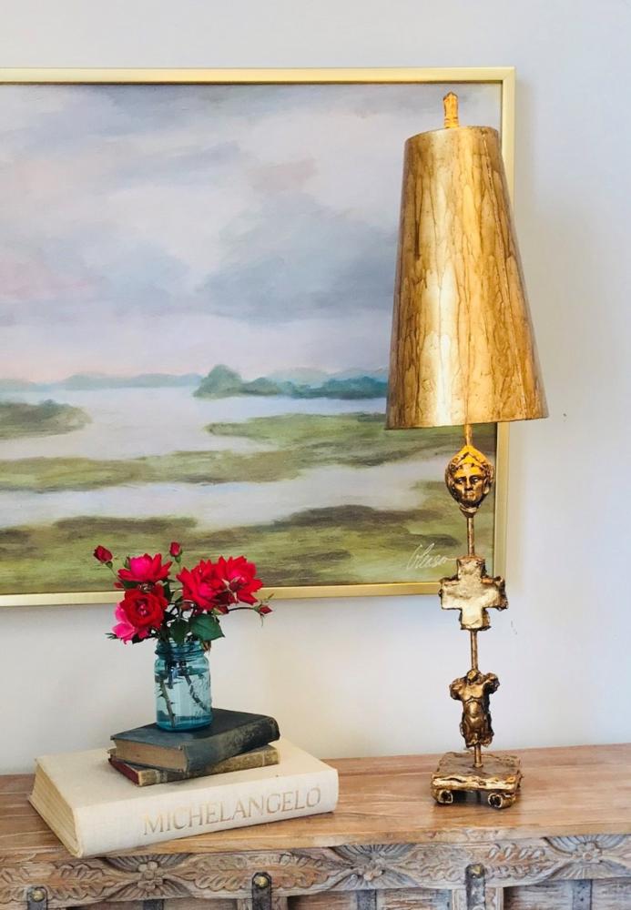 A Fragment table lamp in antique gold leaf with textured resin, paired with a gold drum shade. Its vintage-modern mix makes it a focal point for entryways or living spaces.