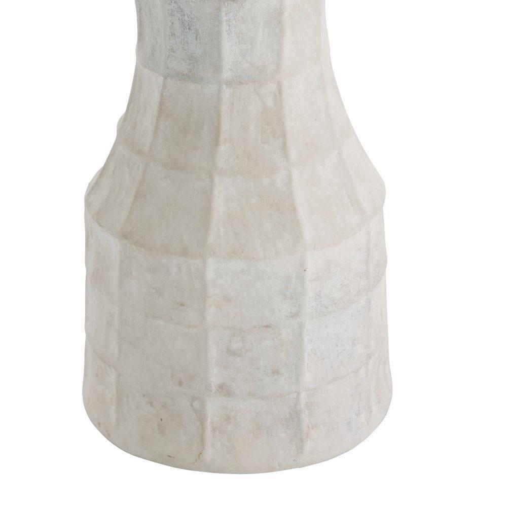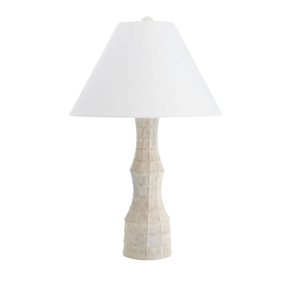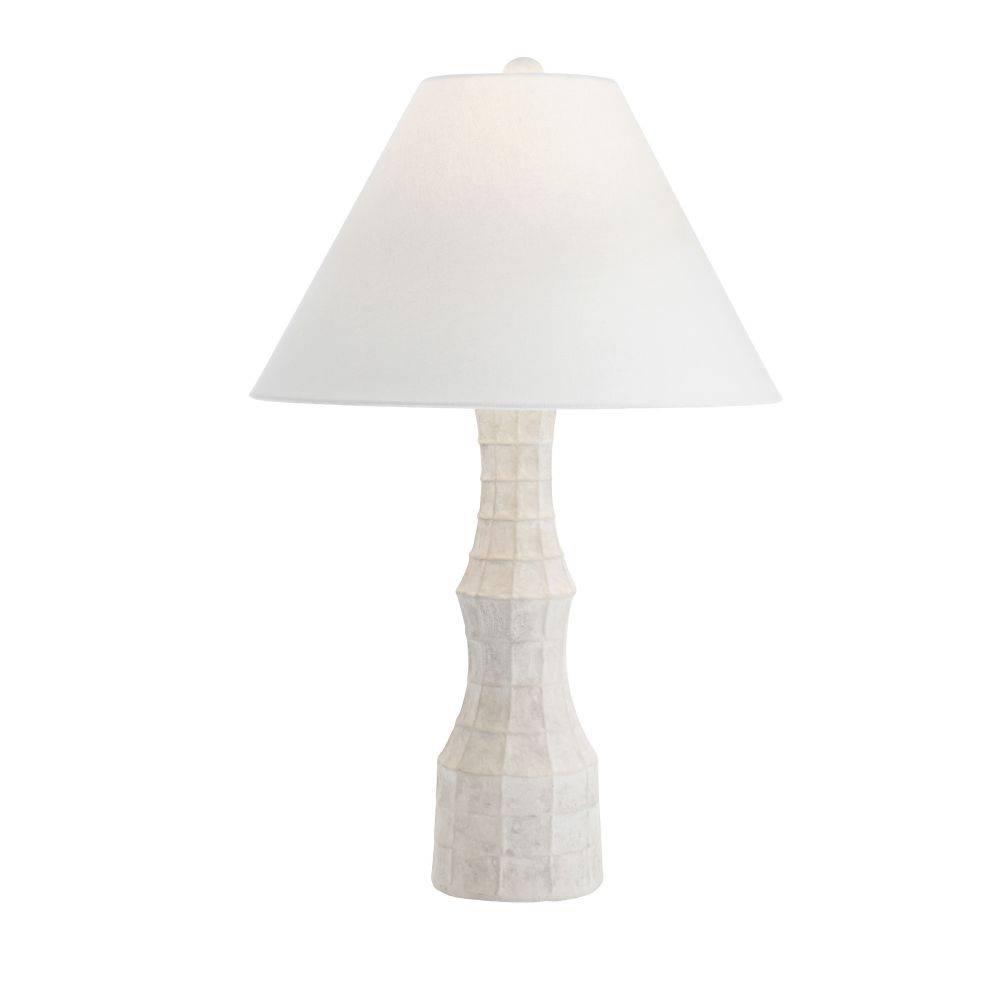 The textural embossing on our terracotta Francine may recall a bat's wing or spider's web. Evoking an ancient structure, this inspired accessory is glazed in sheer eggshell and finished with antique brass-plated steel hardware. The off-white linen drum shade is lined in white cotton and matches the ivory finial. Finish will vary.