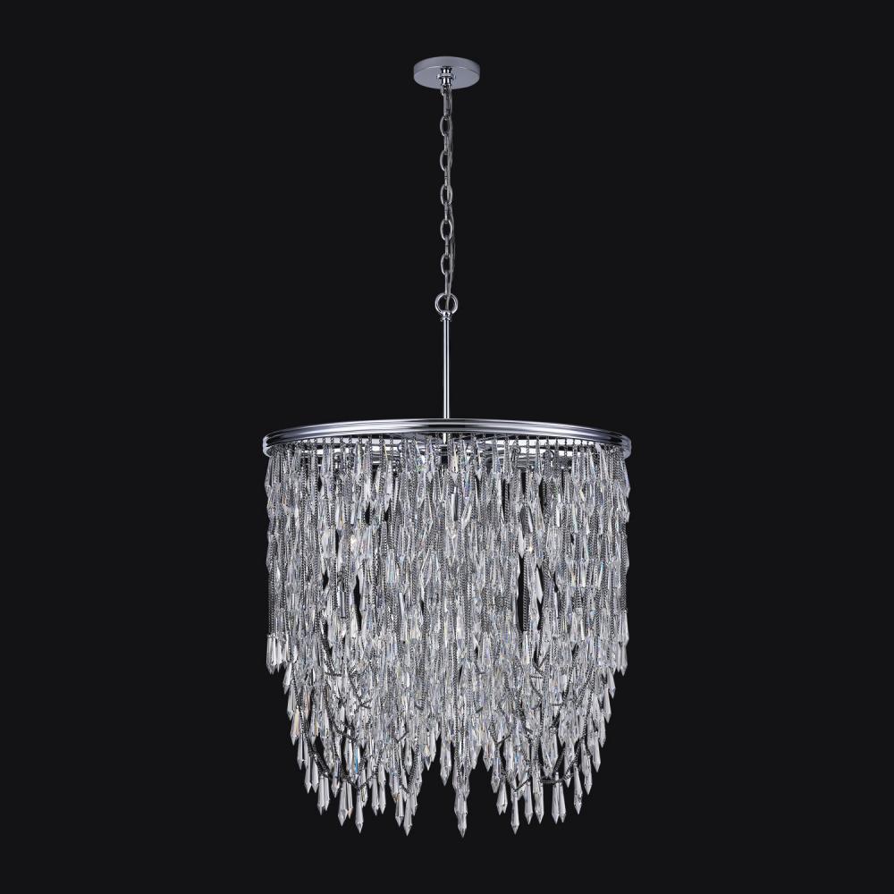Organized randomness of fringe draping and gravity creates the shape of Frangia. Chains act as the support for the crystal spears for a boho glam vibe. Offered in Allegri’s exclusive Polished Chrome or Brushed Champagne Gold Finishes.