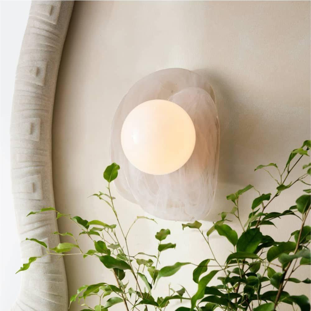 Mimicking a pearl inside an oyster's shell, an opal glass orb is mounted to a handblown swirl glass fixture and secured to a brass-plated iron backplate, this jewel-like light can be hung in any direction. Damp-rated, although limited covered outdoor areas may affect finish.