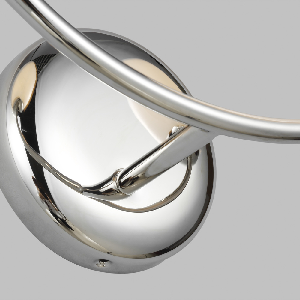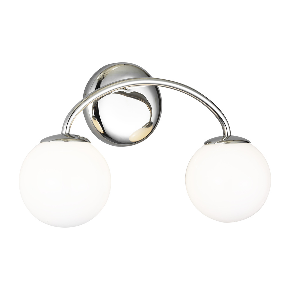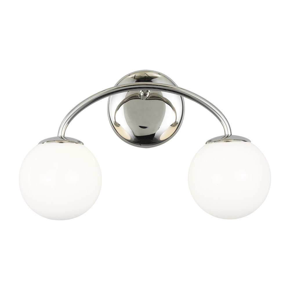 The Galassia two light wall sconce by AERIN in polished nickel perfectly balances a glass globe and curving teardrop frame, giving it a contemporary look. The white glass casts a soft, welcoming glow over a space. This piece works particularly well in a hallway.